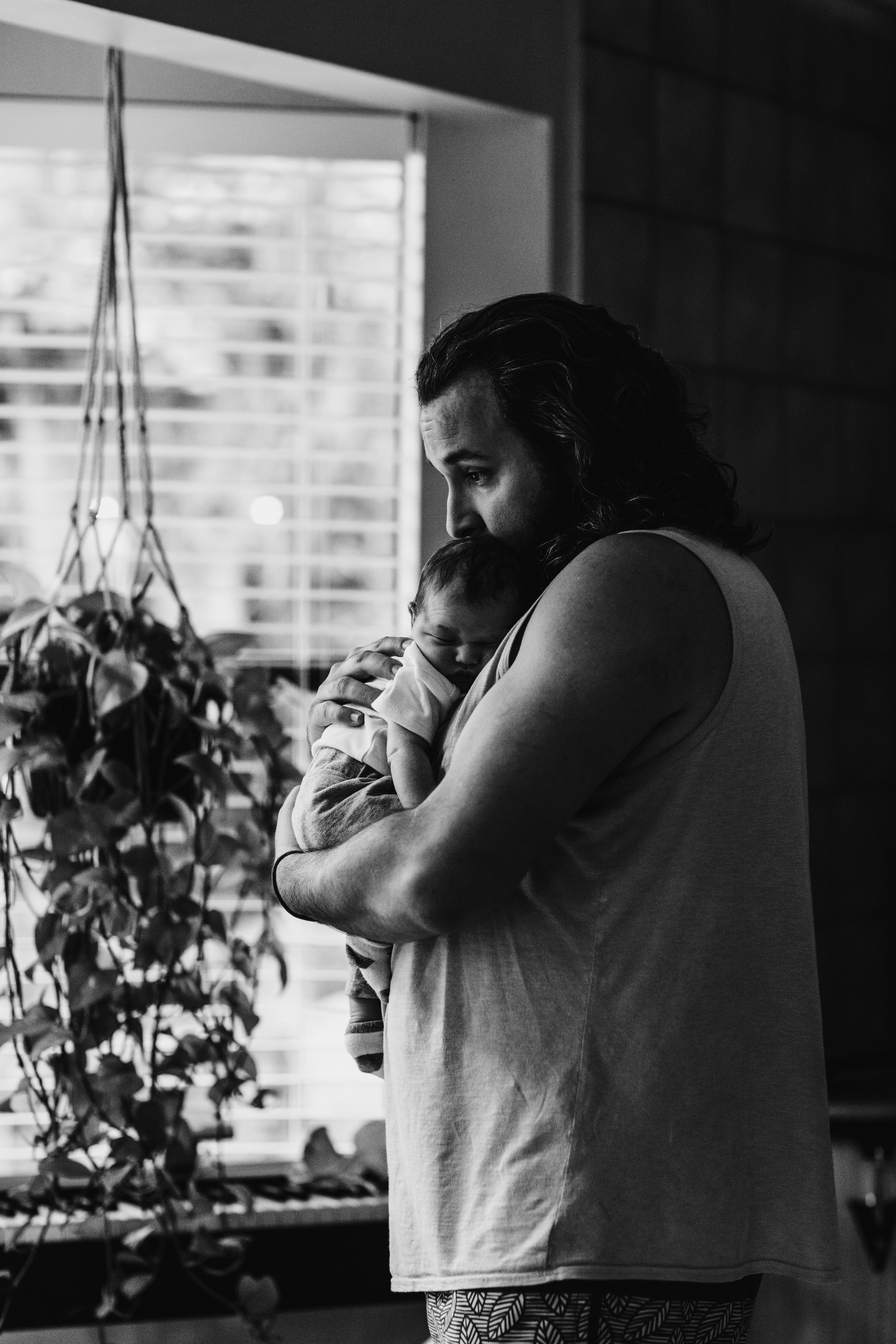 Grayscale Photography Of Man Wearing Tank Top Carrying Newborn