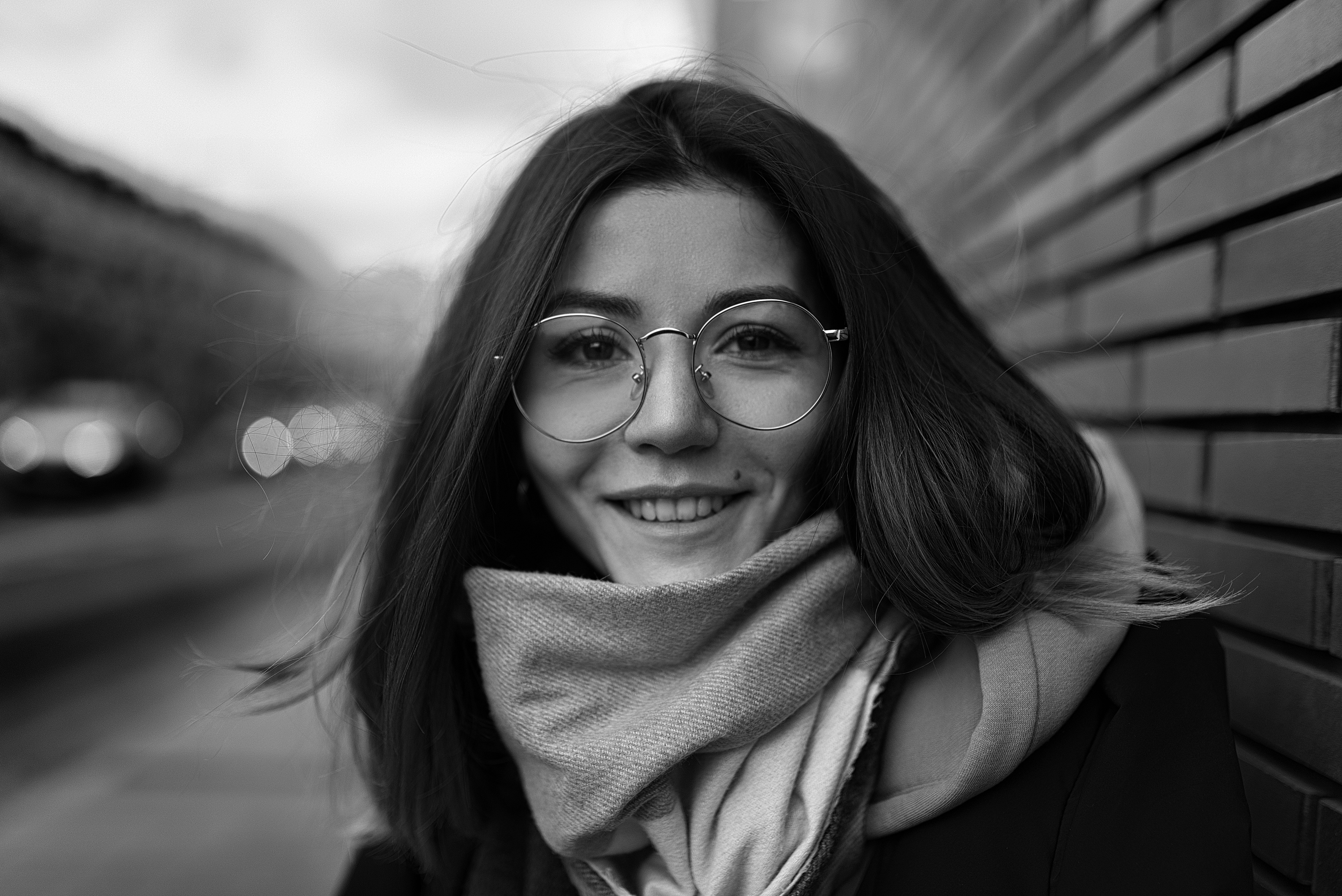 Grayscale Photo Of Woman Wearing Eyeglasses And Scarf Photo Free
