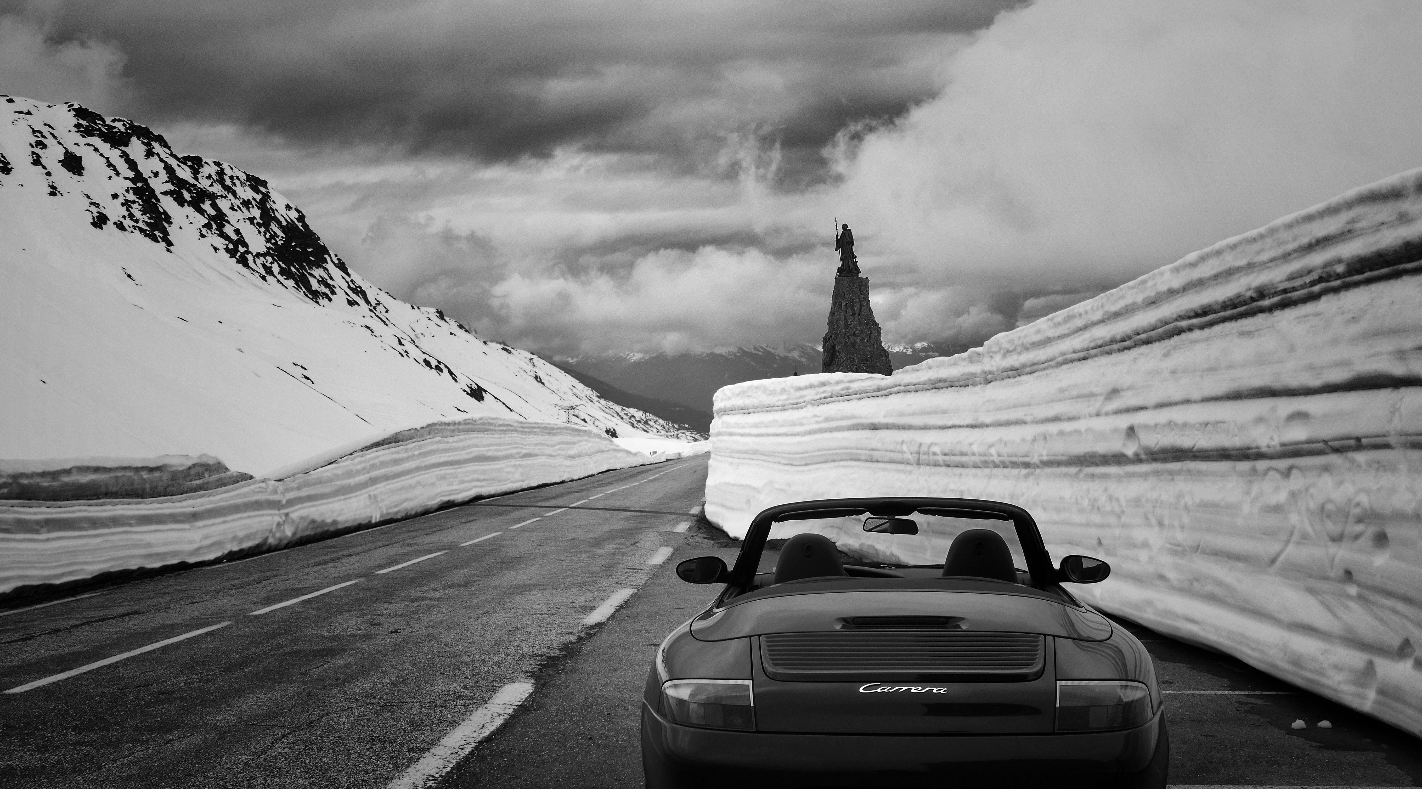 Grayscale Photography Of Classic Car On Road Beside Street Sign Hd Wallpaper Wallpaper Flare