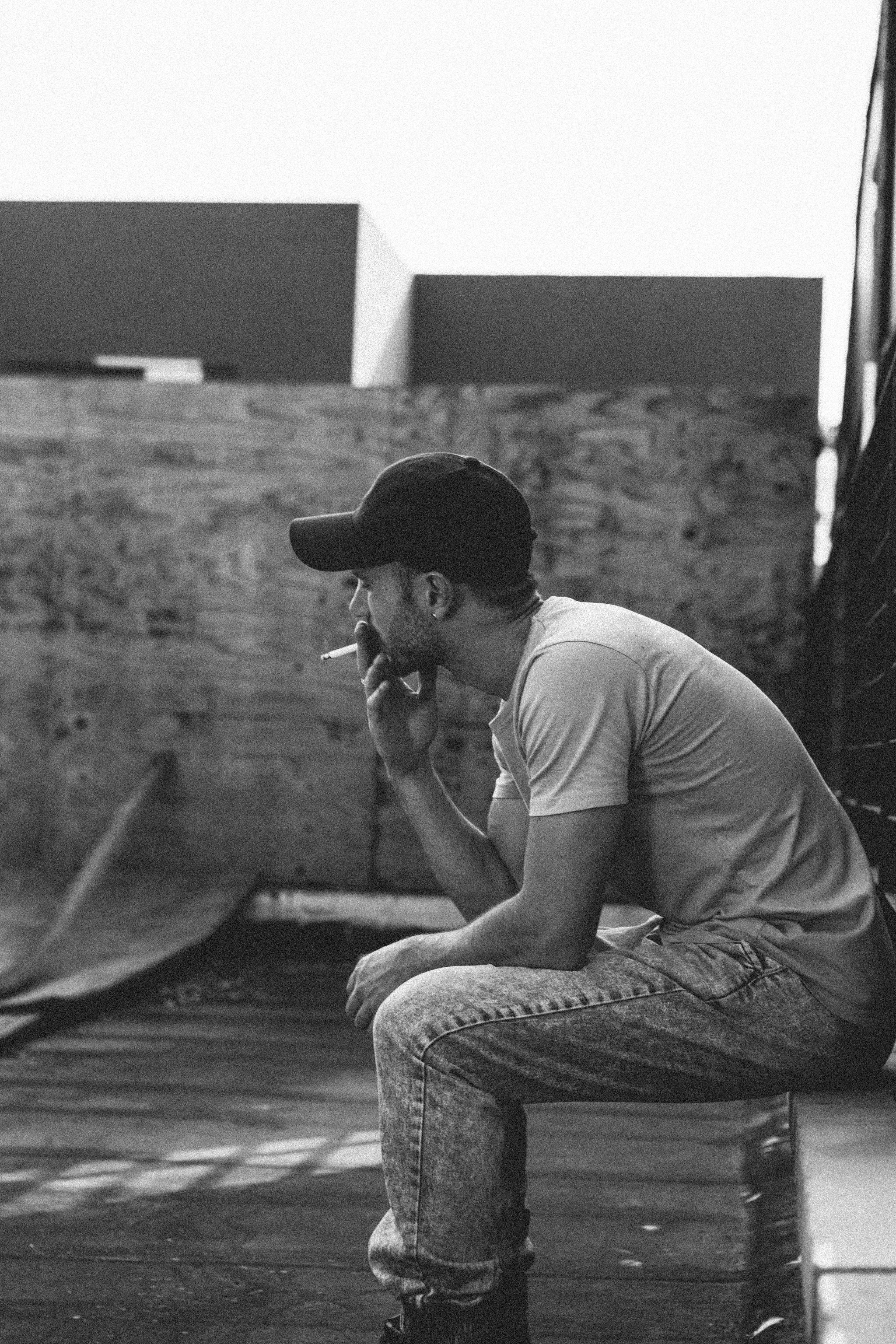 Grayscale Photography Of Man Smoking While Sitting On Concrete