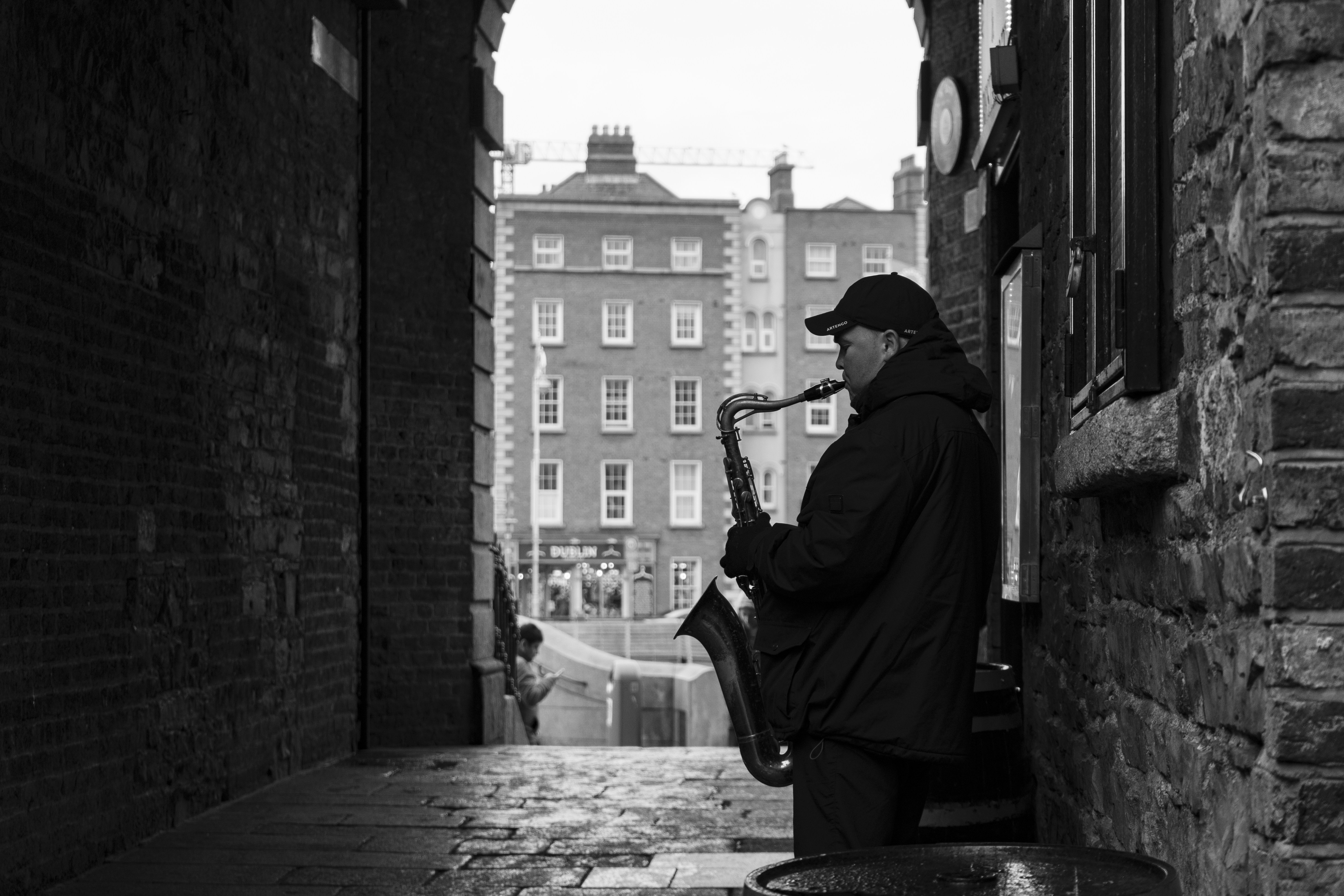 Man In Black Jacket Playing Saxophone Sitting On Concrete Bench In