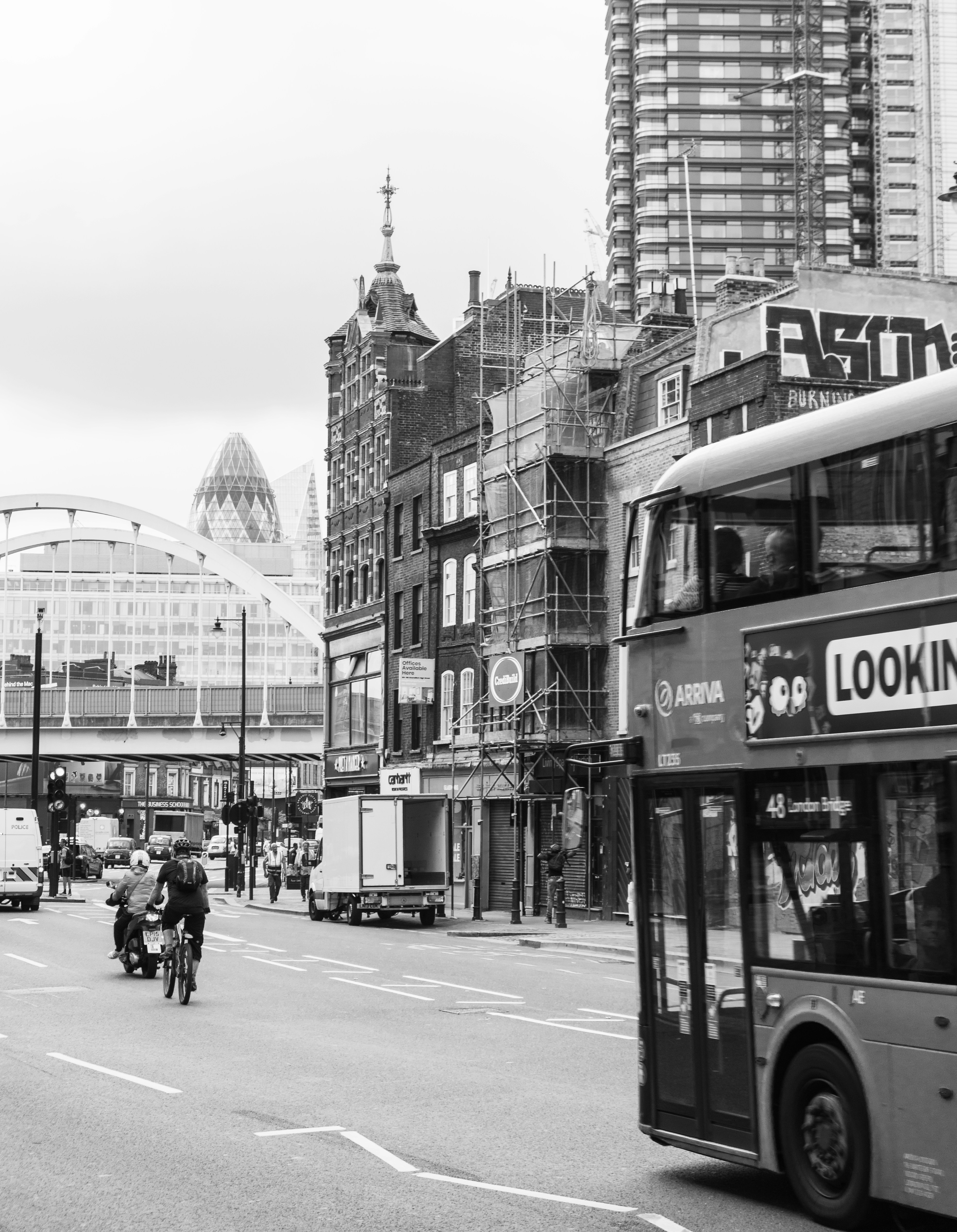 Grayscale Photo Of People Walking On Street Near Building Photo