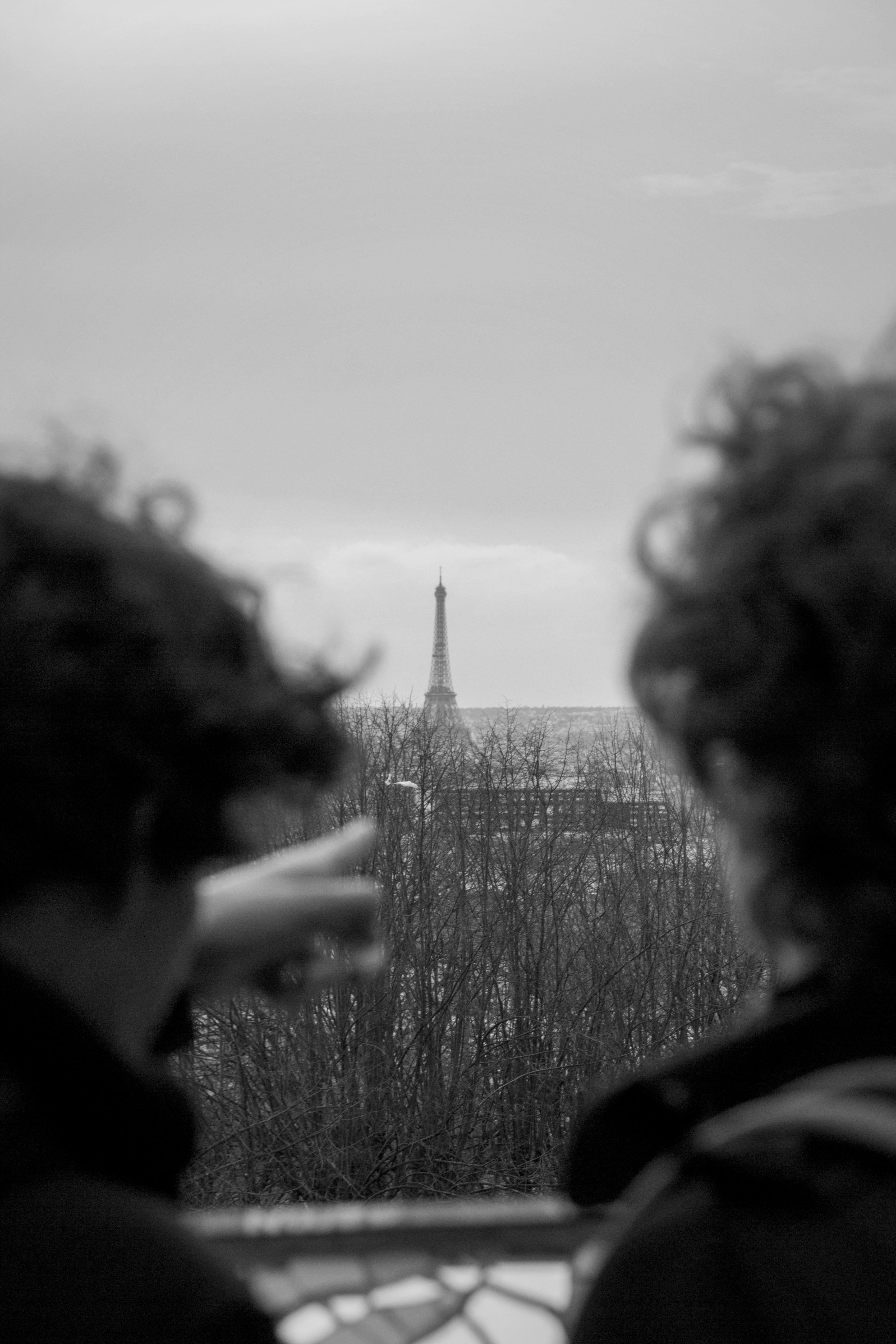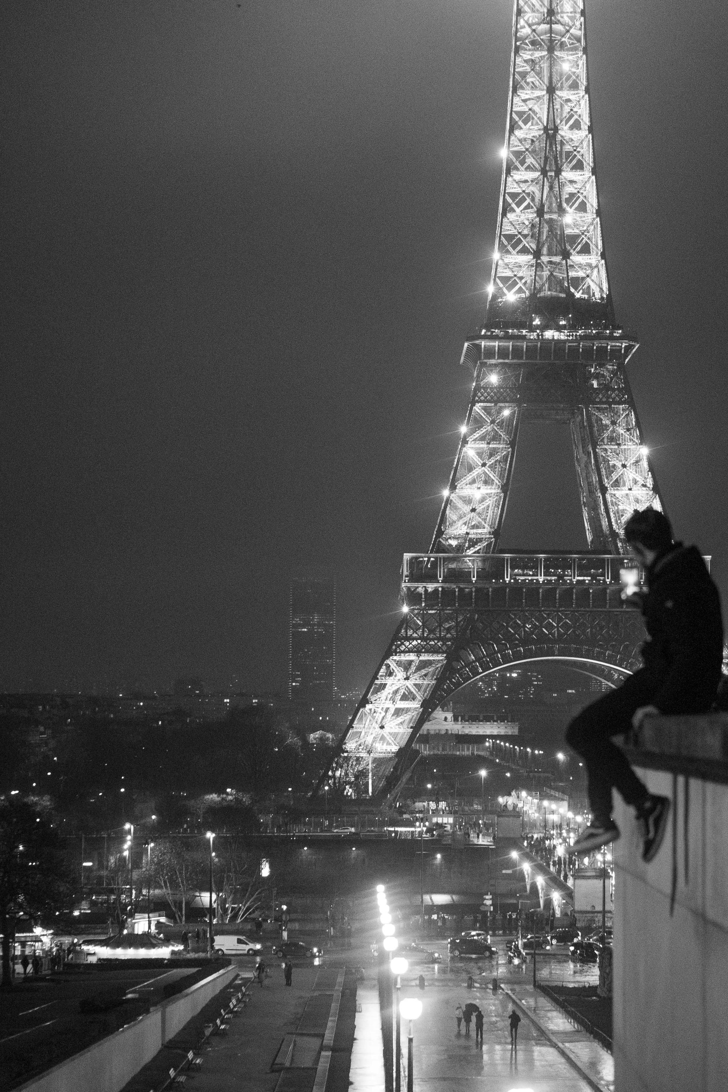 Grayscale Photo Of Man Sitting On Rooftop Near Eiffel Tower Paris