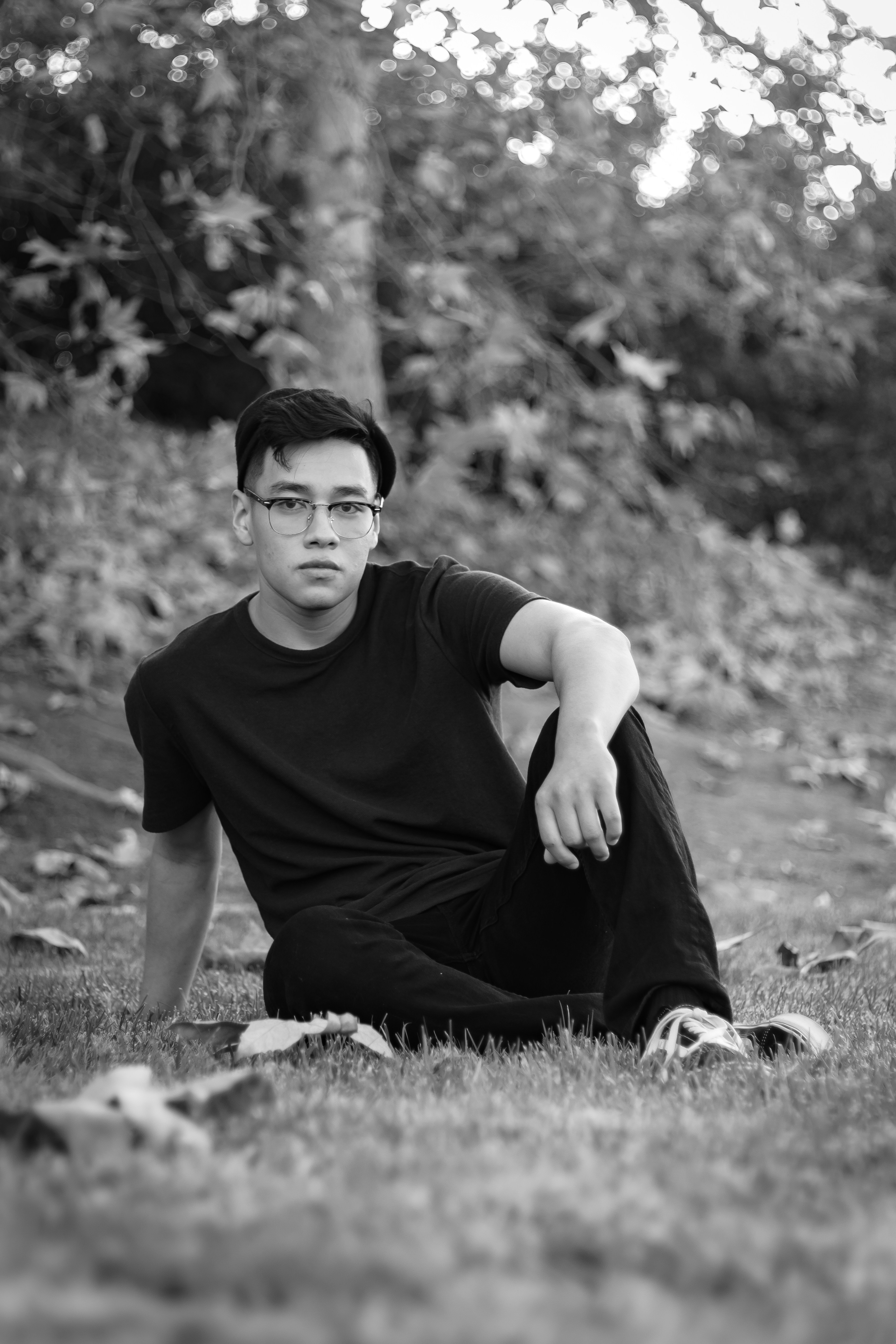 Man In Black Crew Neck T Shirt Sitting On Ground In Grayscale