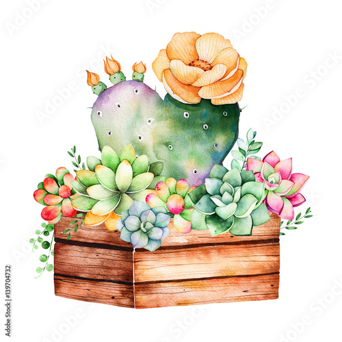 Watercolor Handpainted Succulent Plant In Wooden Pot And Cactus