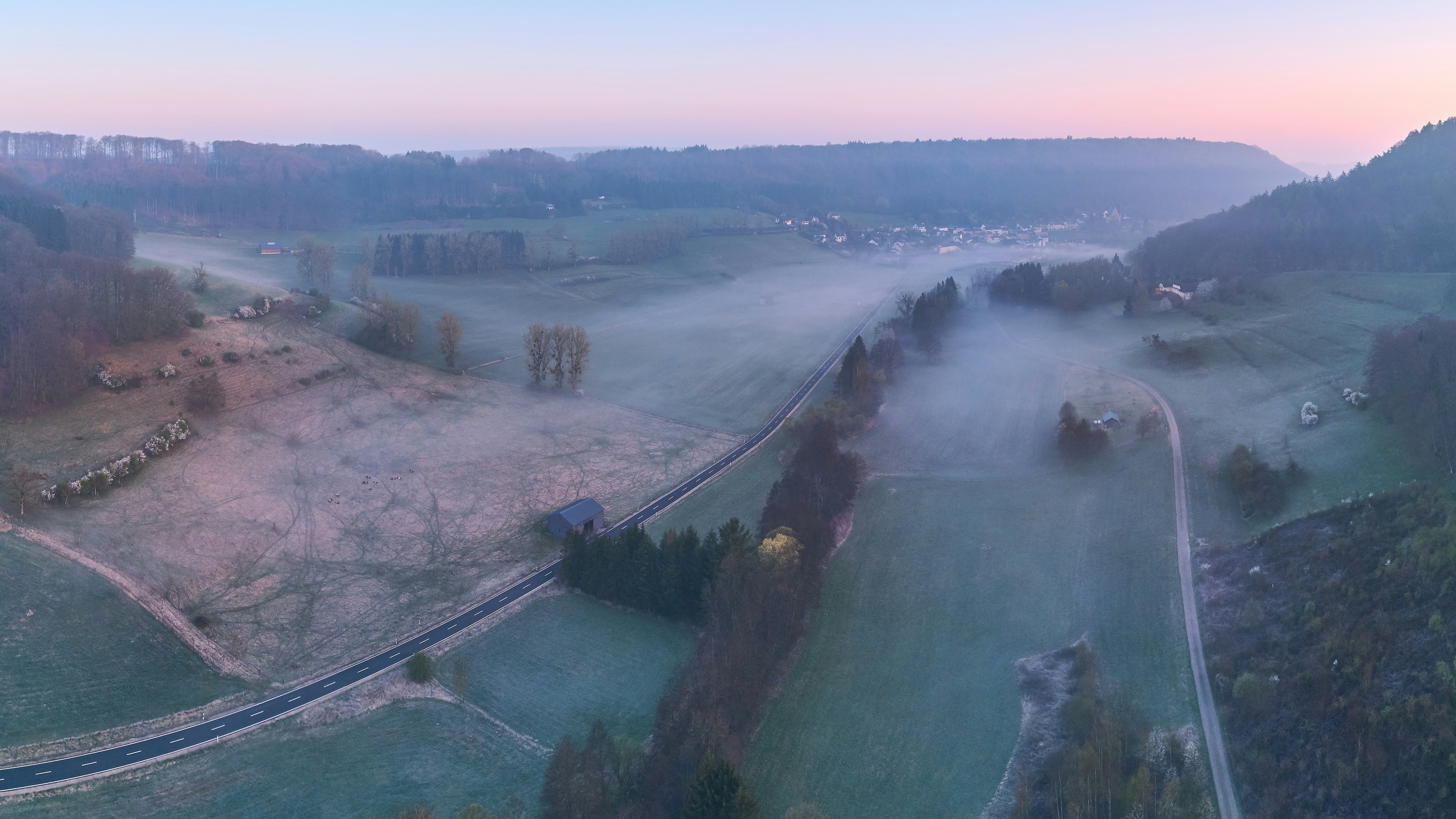 Aerial Photo Of Green Field With Houses Body Of Water And