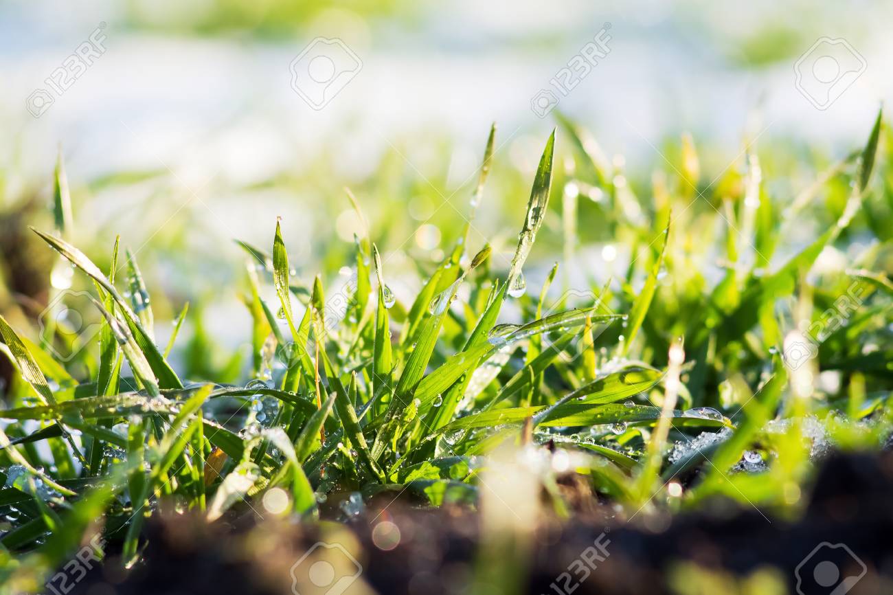 Green Grass With Dew Drops On The Background Of Snow Sunny Winter