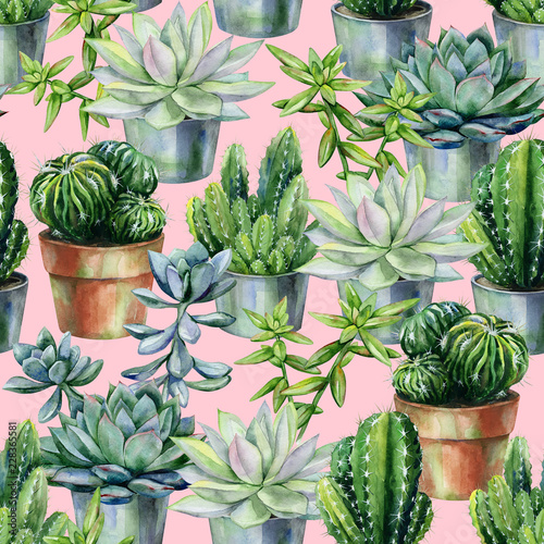 Seamless Watercolor Pattern With Cactus And Succulents In Pots