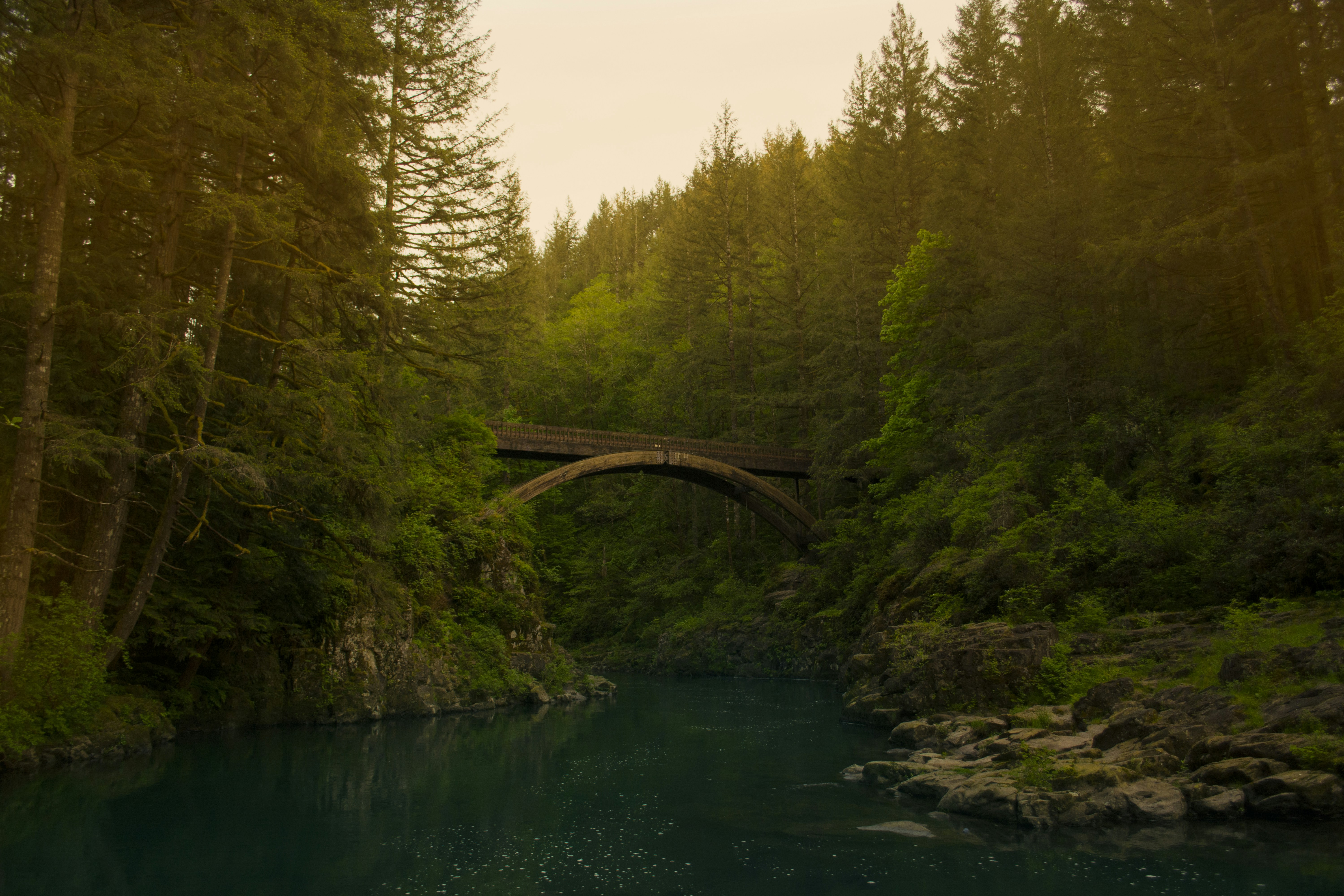 Brown Concrete Bridge Near Green Trees And Body Of Water Photo