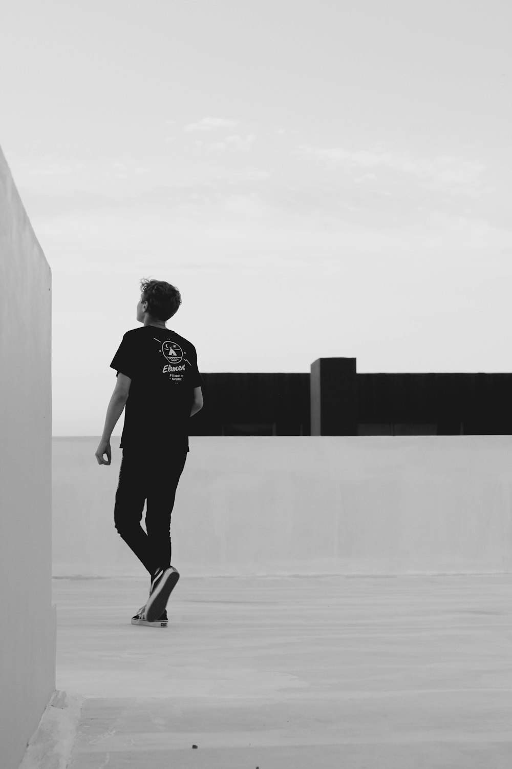 Man Standing On Cliff In Grayscale Photo Photo Free Black And