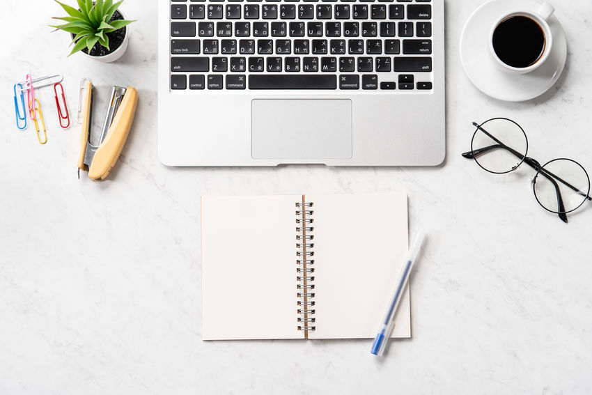 Office Desk Table With Computer Supplies And Coffee Cup Stock