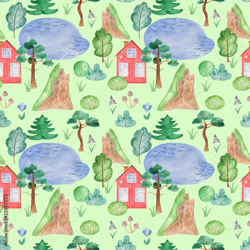 Watercolor Seamless Pattern With House Hill Lake Trees Texture