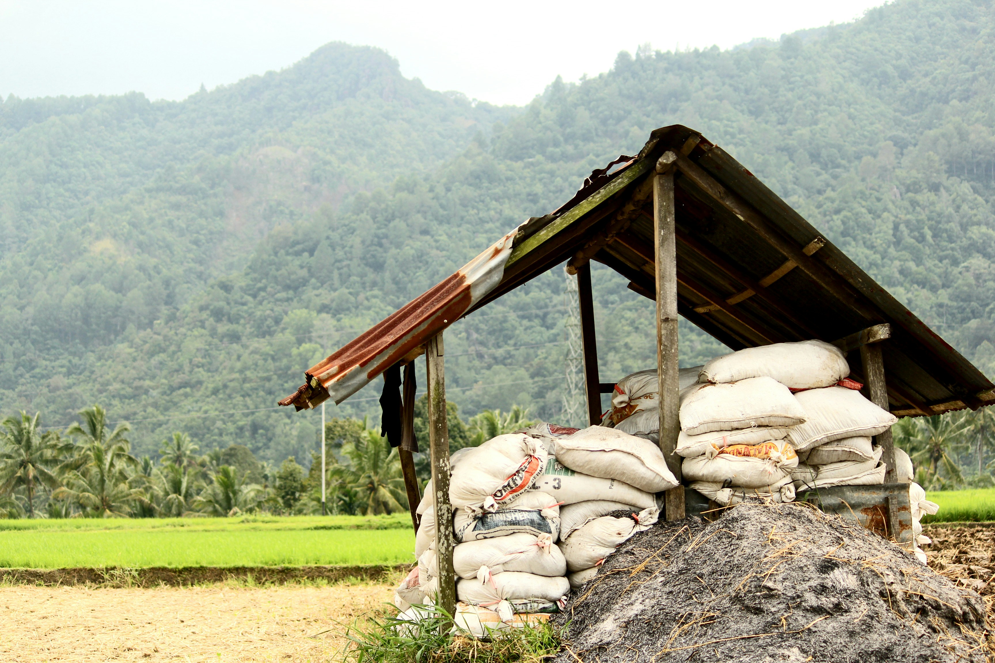 Stack Of White Sacks Near Rice Field Photo Free Nature Image On