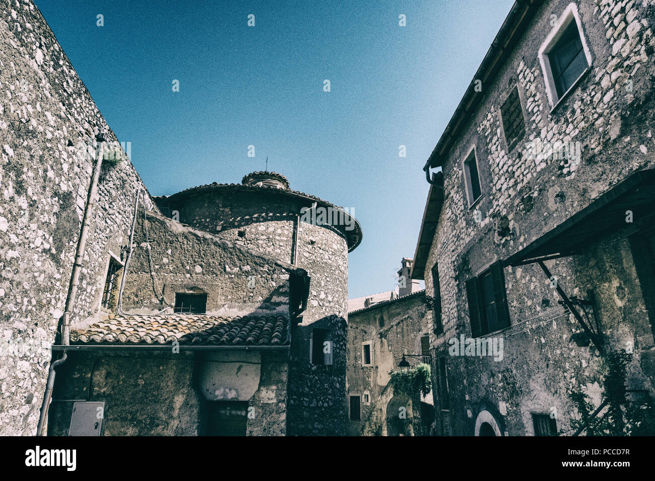 Low Angle View Of Ancient Stone Walls Of Buildings Of A Medieval