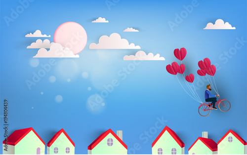 A Man Riding Bicycle To The Sky And Holding Red Heart Balloons
