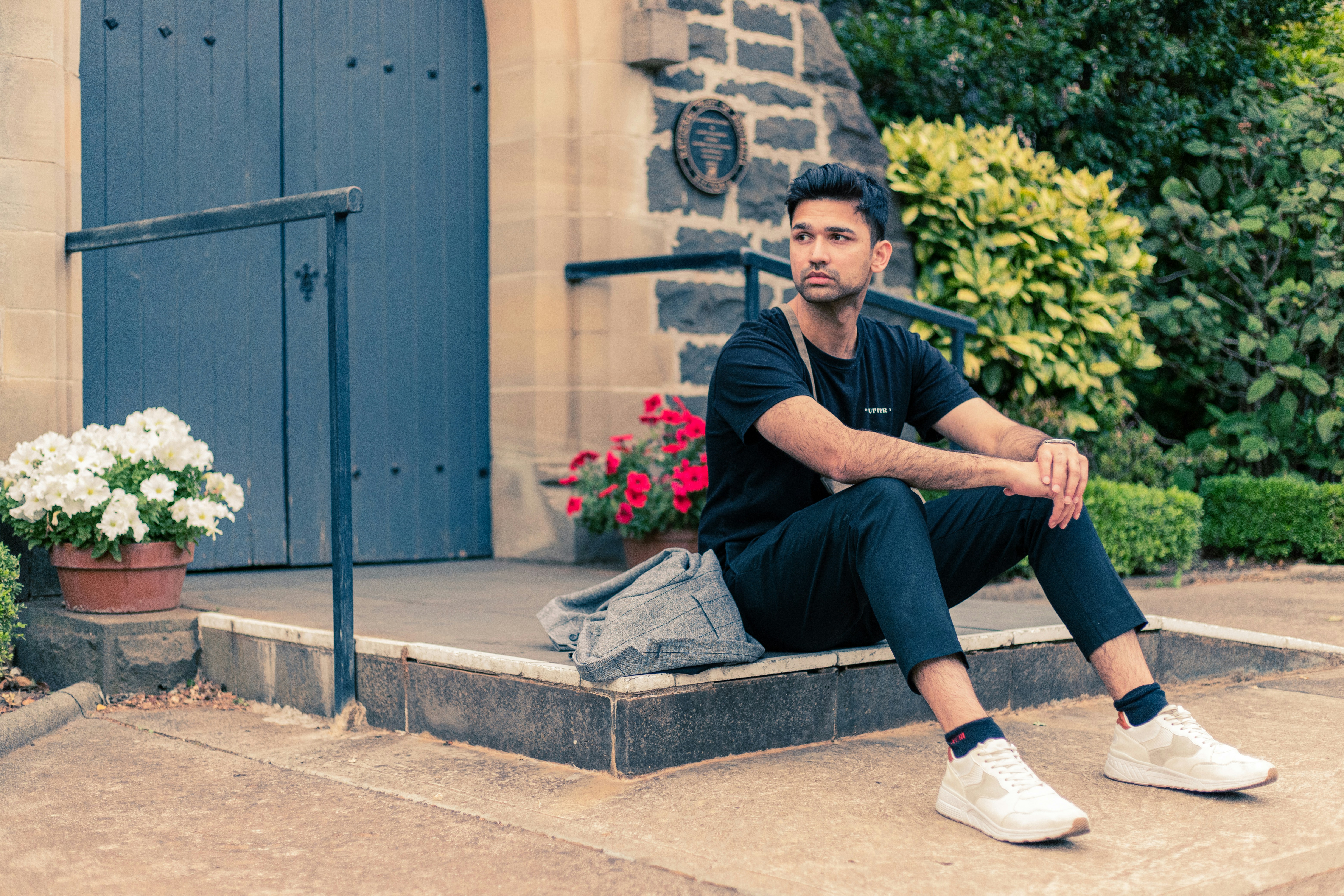 Man In Black Long Sleeve Shirt And Blue Denim Jeans Sitting On