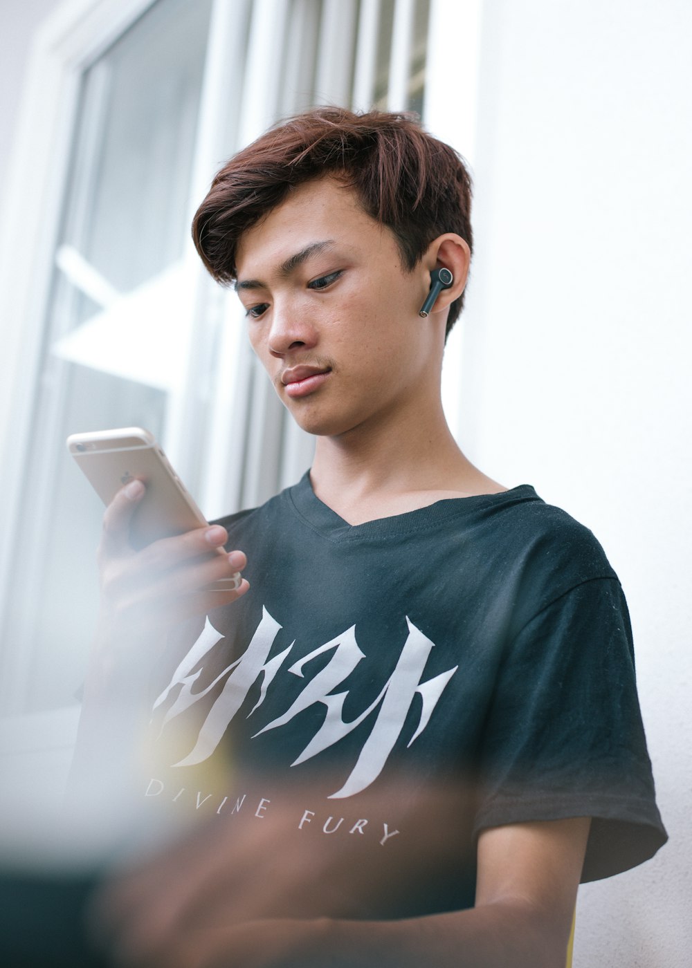 Man Holding Phone Sitting On Brown Wall Photo Free Human Image