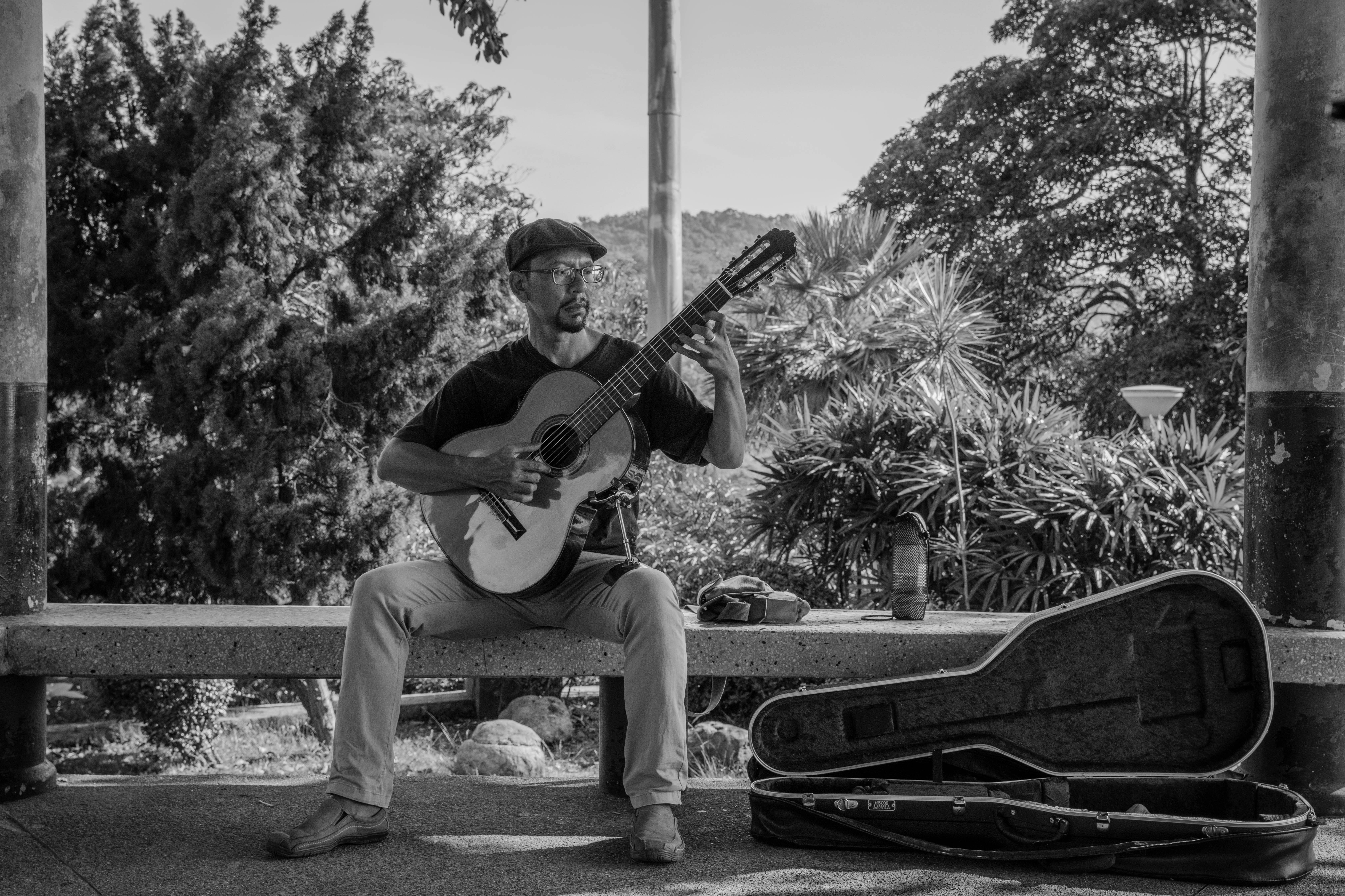Grayscale Photography Of Man Playing Classic Guiar Photo Free
