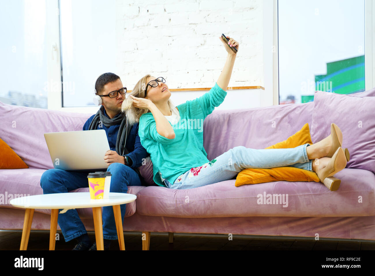 Man And Woman Sit On The Couch Chatting And Using Smartphone