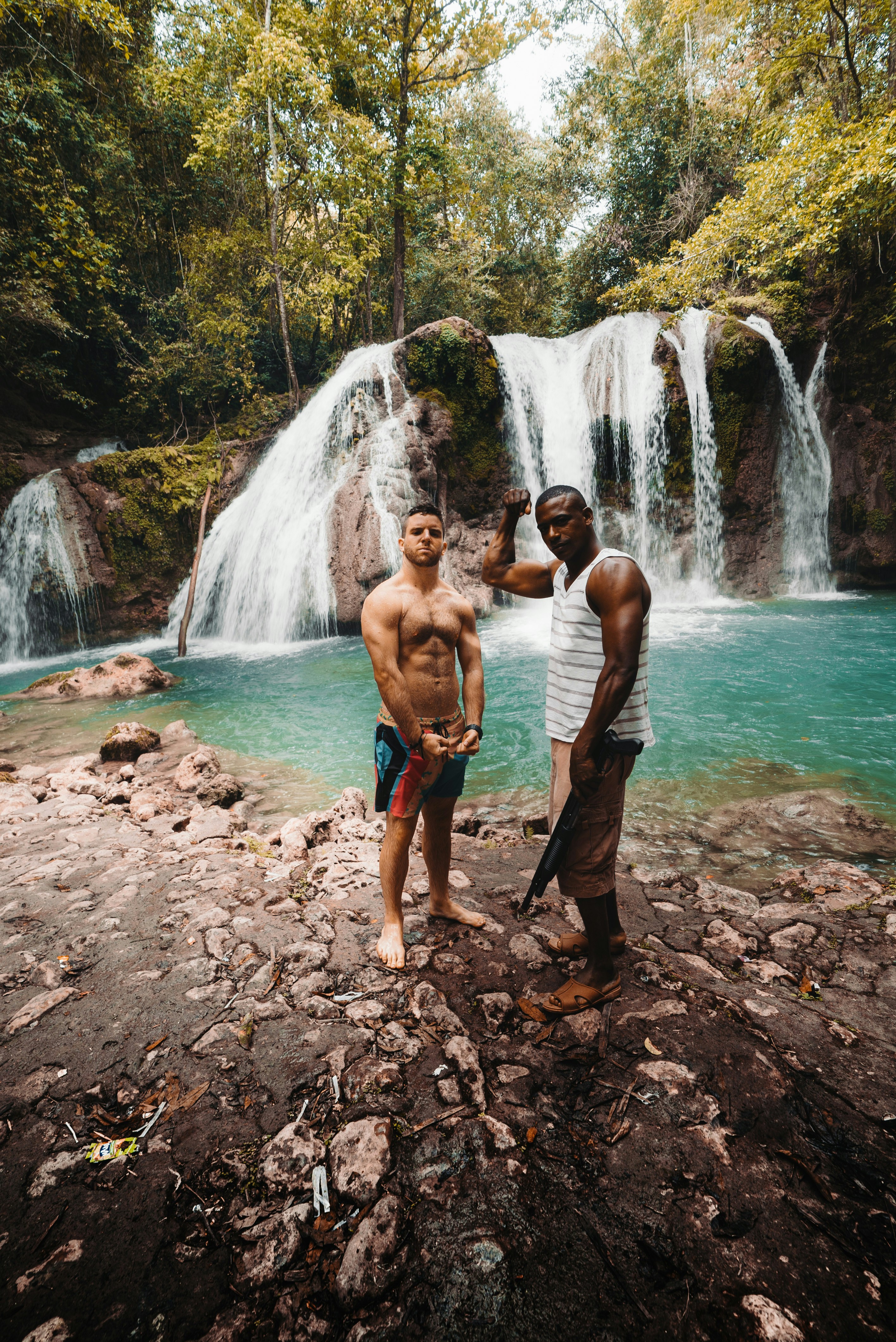 Two Man Standing In Front Of The Waterfalls During Daytime Photo