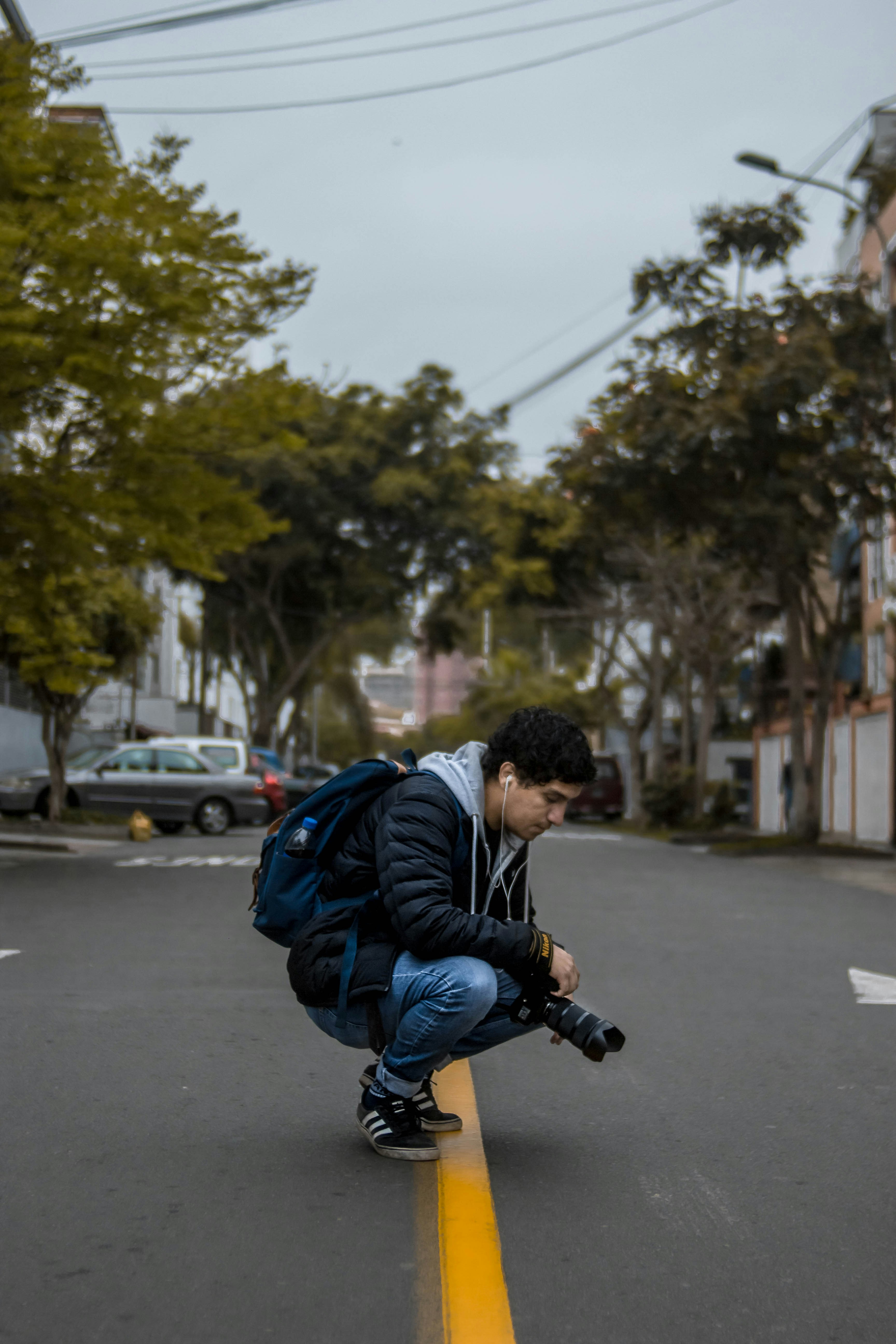 Man Wearing Bubble Jacket Squatting On Road Photo Free Human