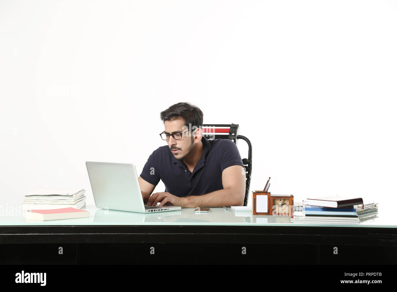 Business Man Is Working On Laptop With Wearing Black Glasses In
