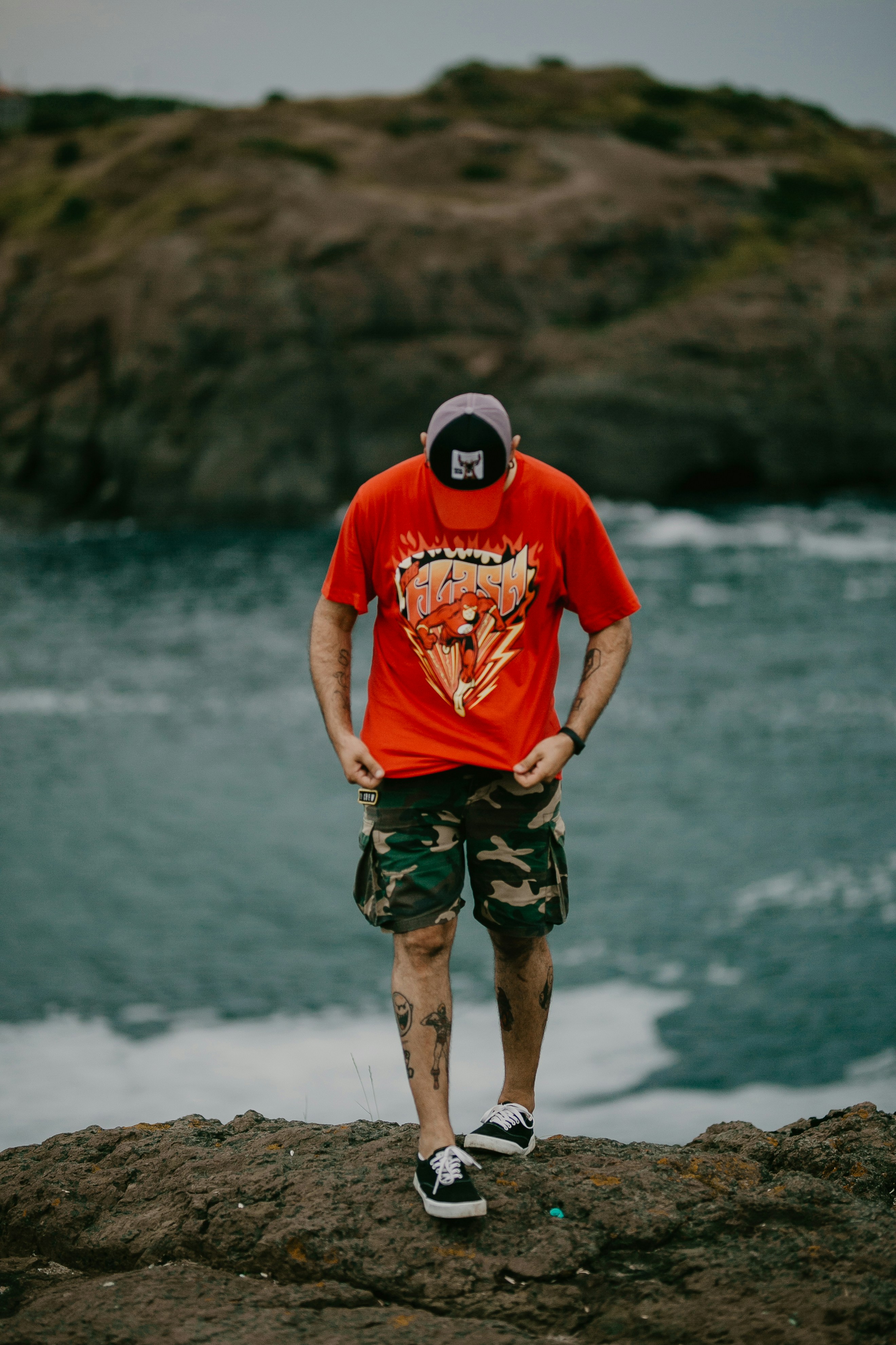 Man In Red Shirt Standing On Rock Near Body Of Water Photo Free