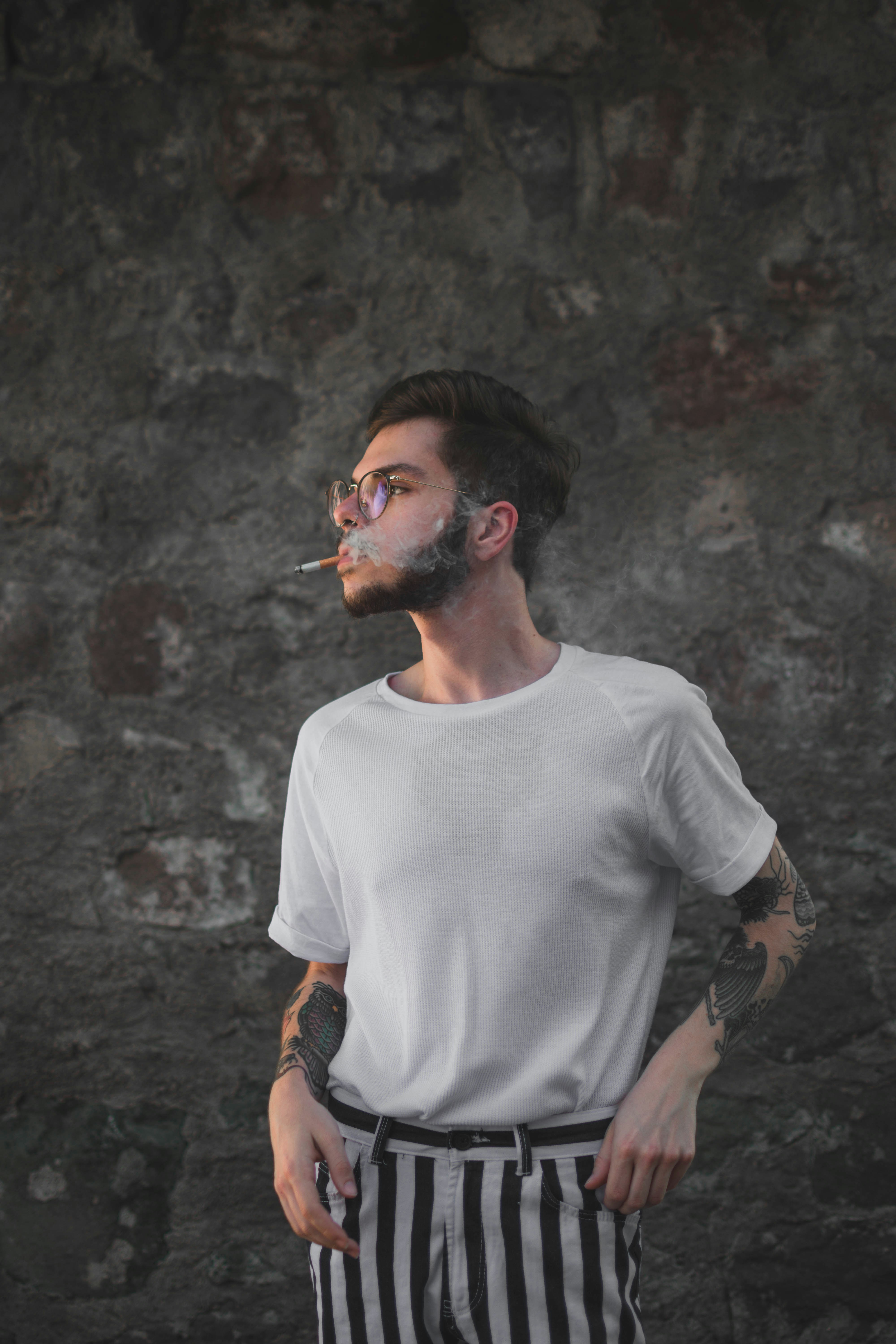 Man In White Crew Neck T Shirt And Striped Pants Smoking By Wall