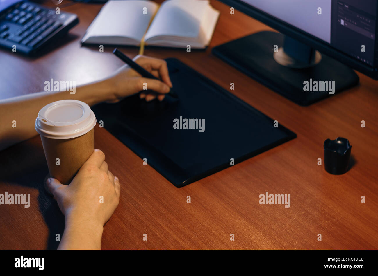 Desktop Side View Computer Graphics Tablet Diary Cup Of Coffee