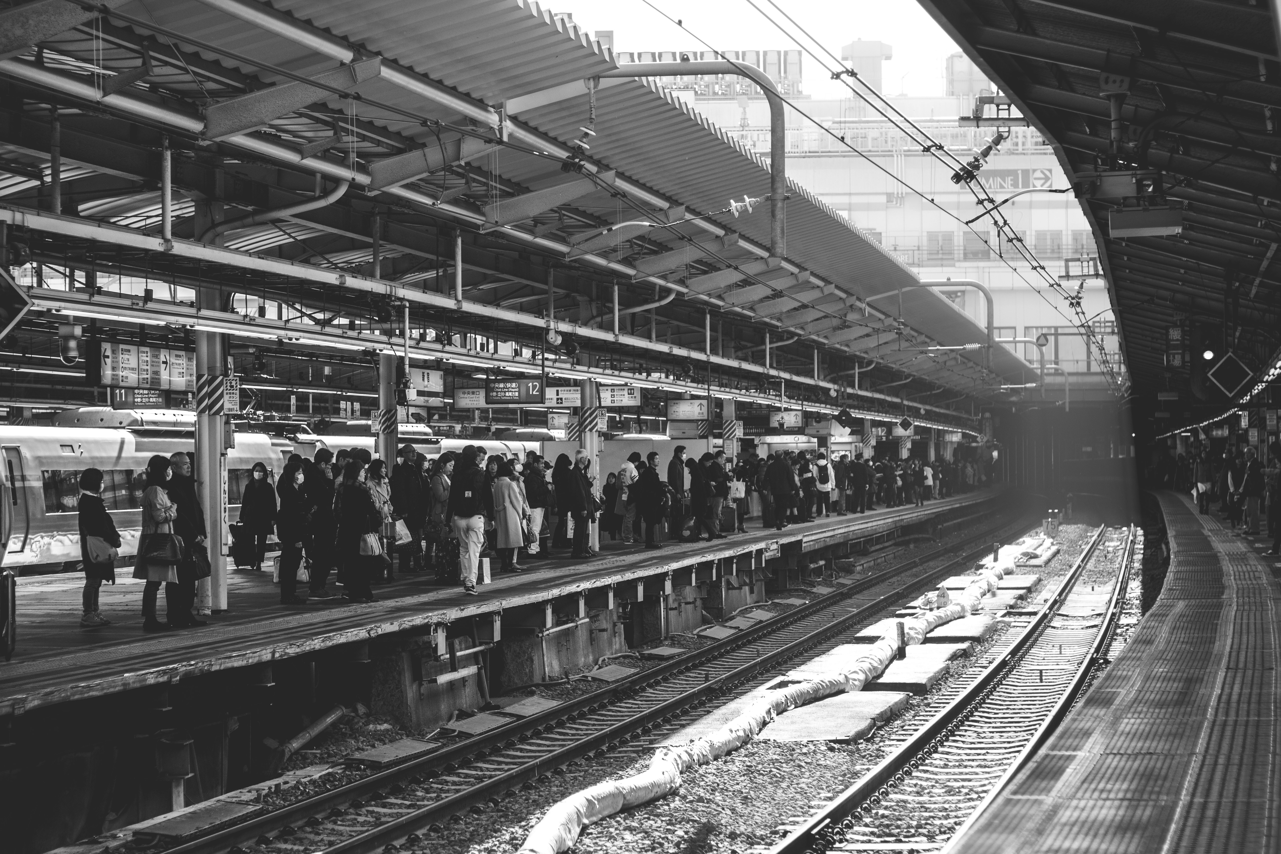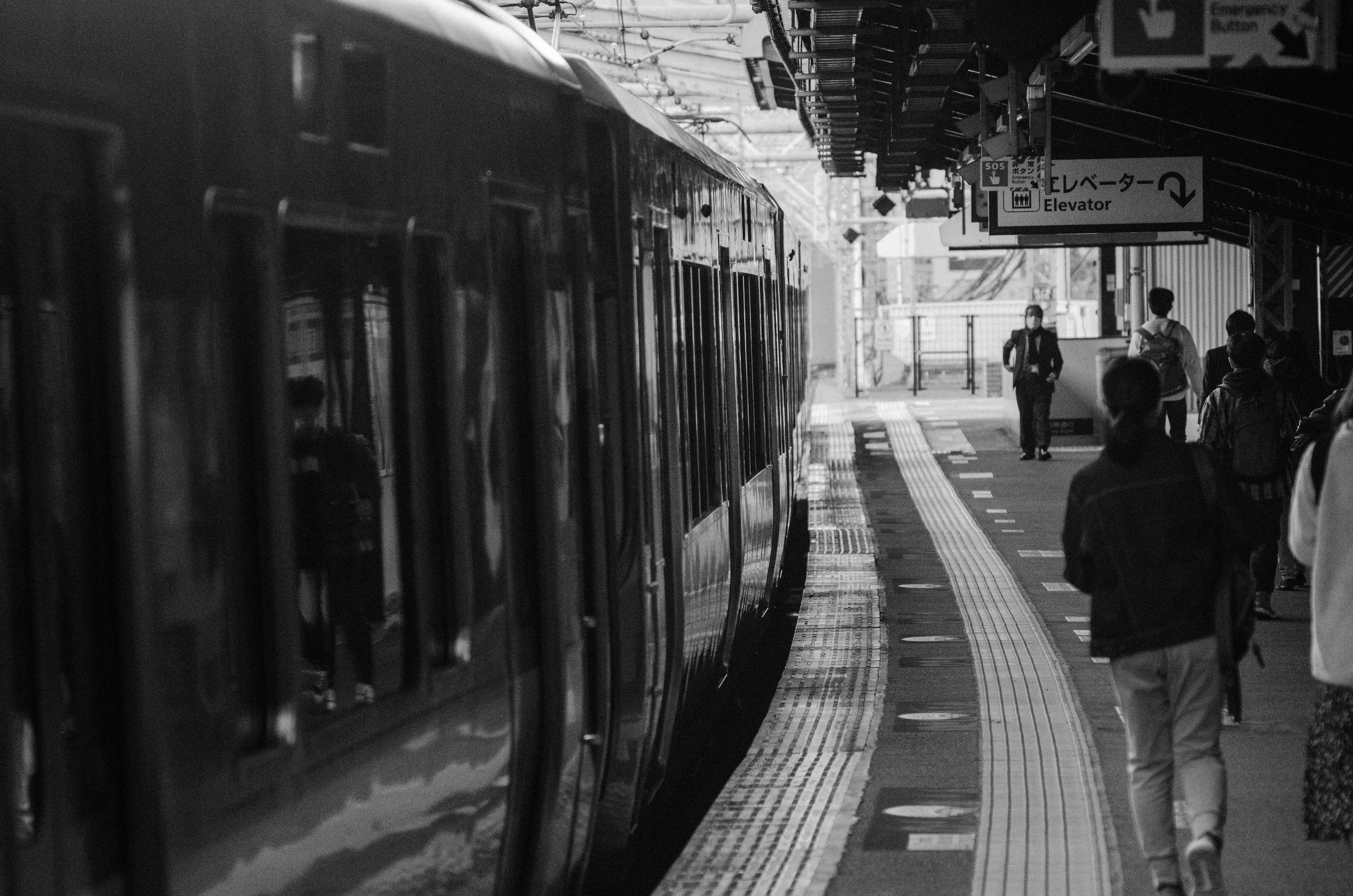 Grayscale Photography Of People Walking Beside Train Photo Free
