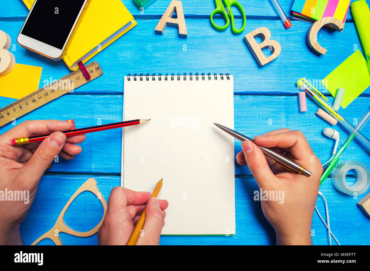 Three Hands With Pencils And Pens Point To A Notebook With White