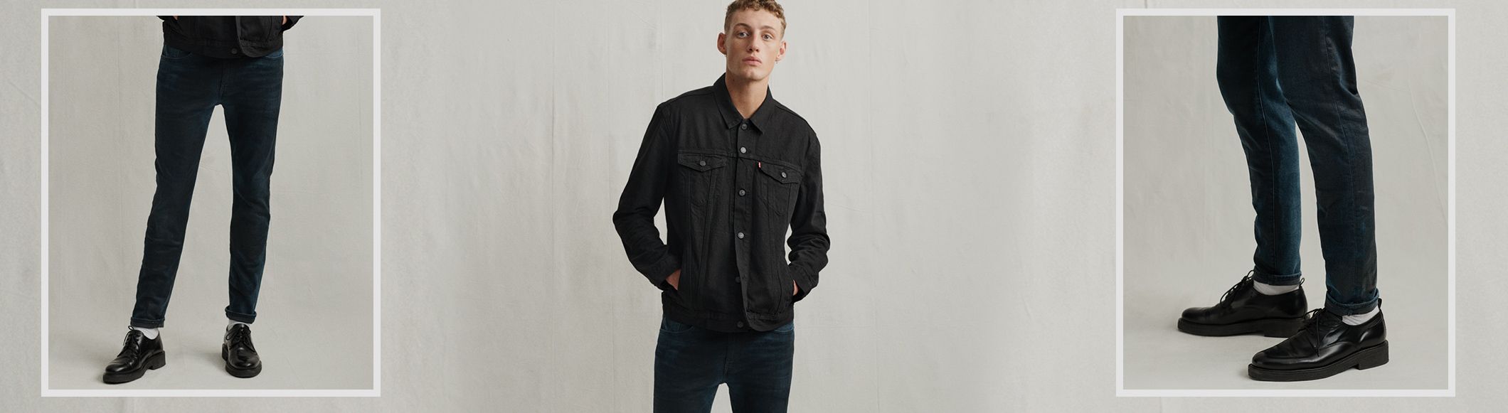 Man Wearing Distressed Black Denim Fitted Jeans And Pair Of Black