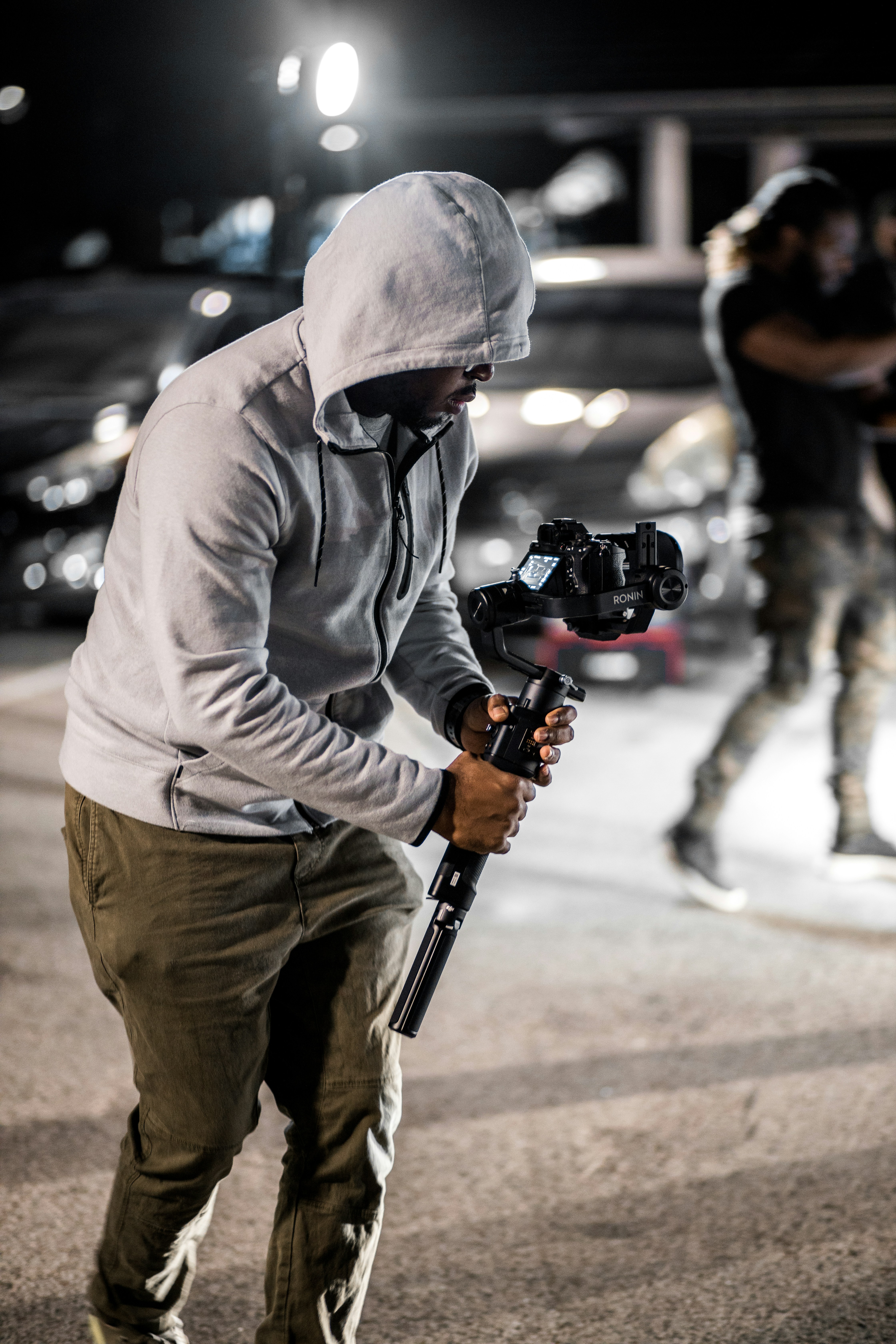 Man In Gray Hoodie And Brown Pants Holding Black Dslr Camera Photo