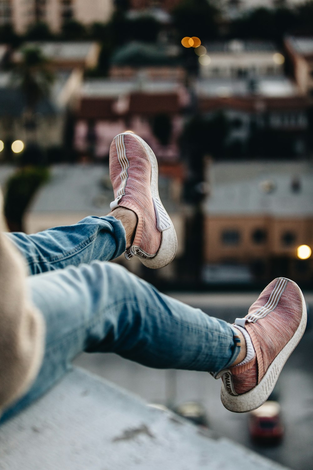 Person Wearing Blue Denim Pants And Brown Boots Sitting On Brown And Black Stone In Front Of Body Of Water Hd Image Wallpapers