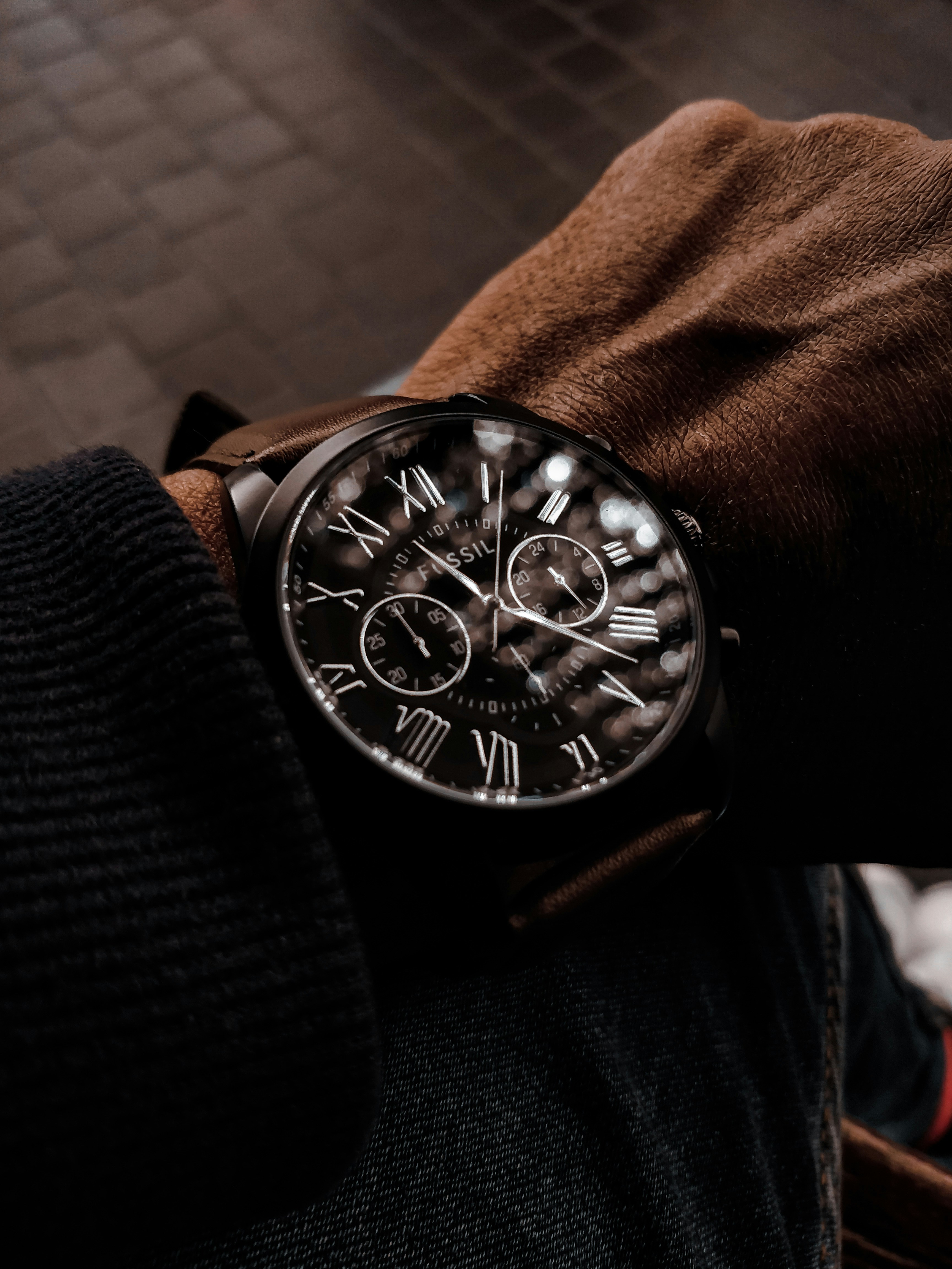 Person Wearing Round Silver Colored Bezel Chronograph Watch With