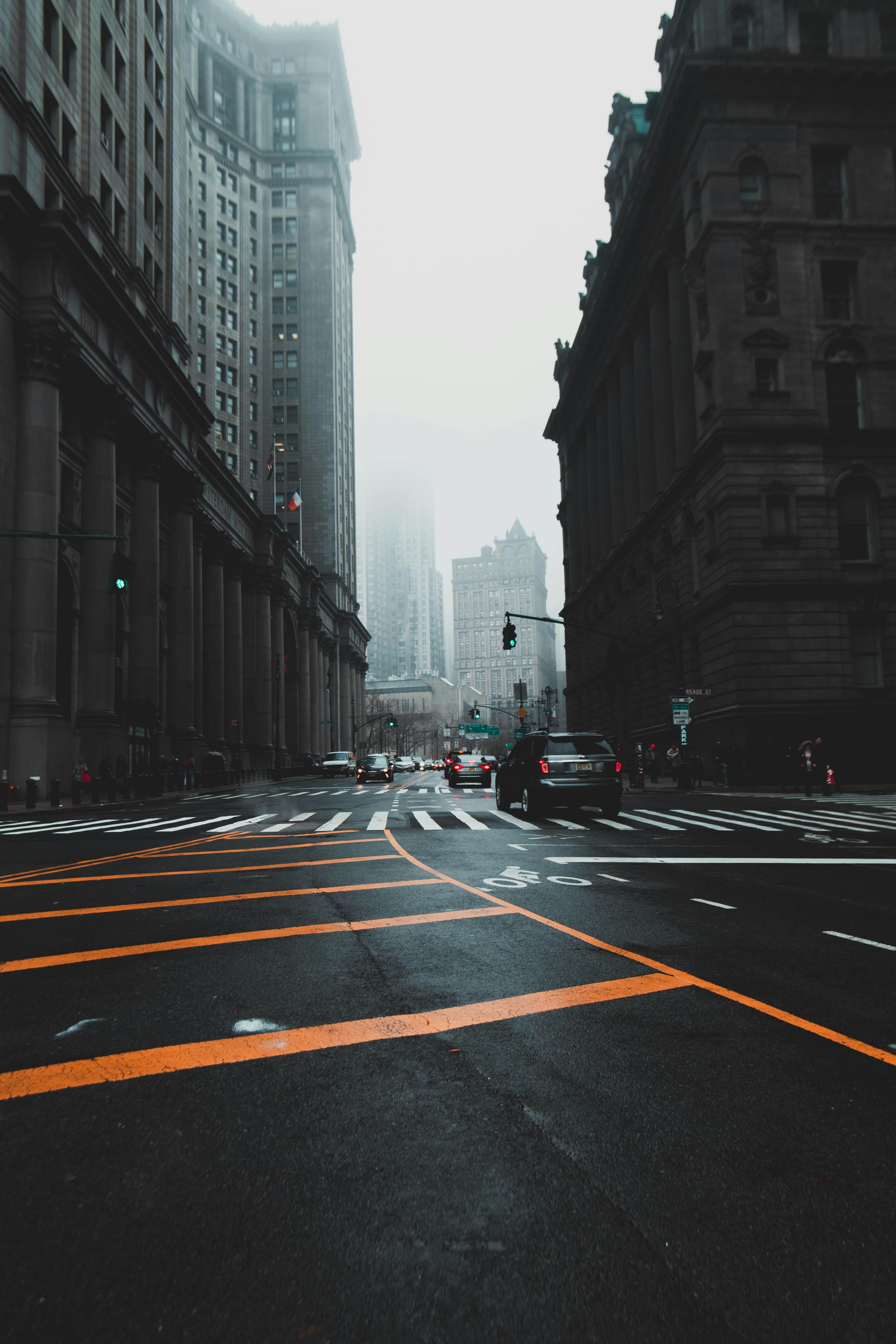 Person Crossing Asphalt Road Between Buildings Photo Free Road