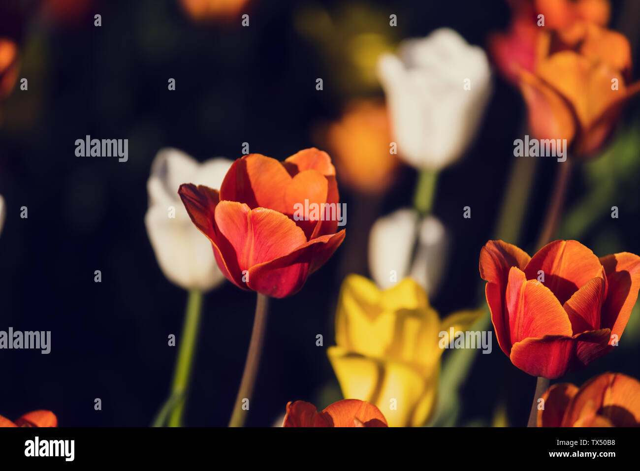 Multi Colored Field With Red Yellow Dark Violet And White Tulips