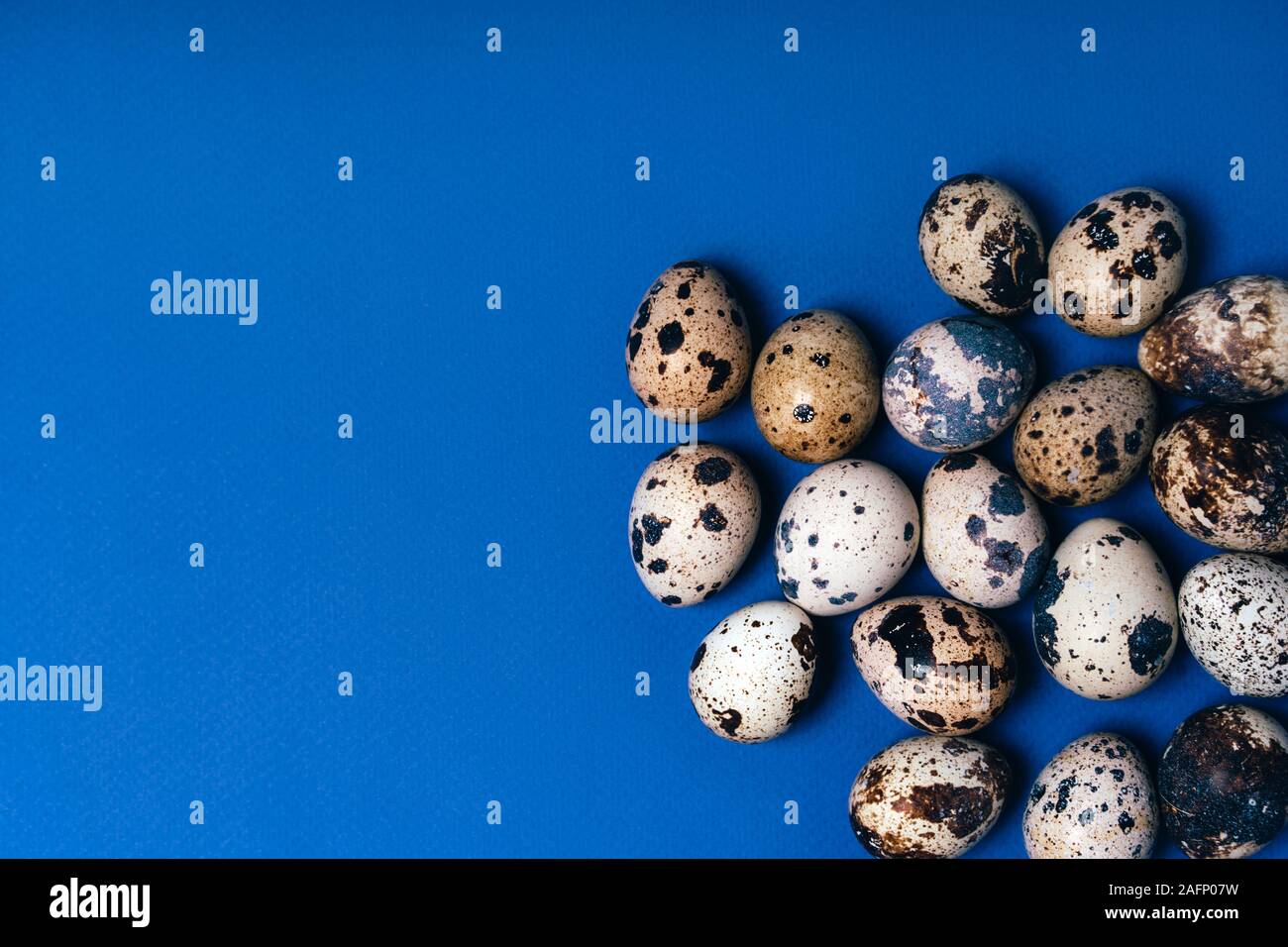 Small Quail Eggs On A Blue Paper Perforated Background Stock Photo