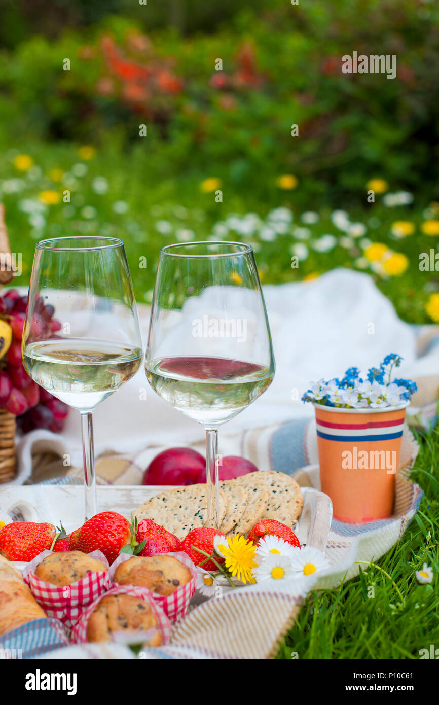 Two Glasses Of Wine And Strawberries Picnic In A Clearing With
