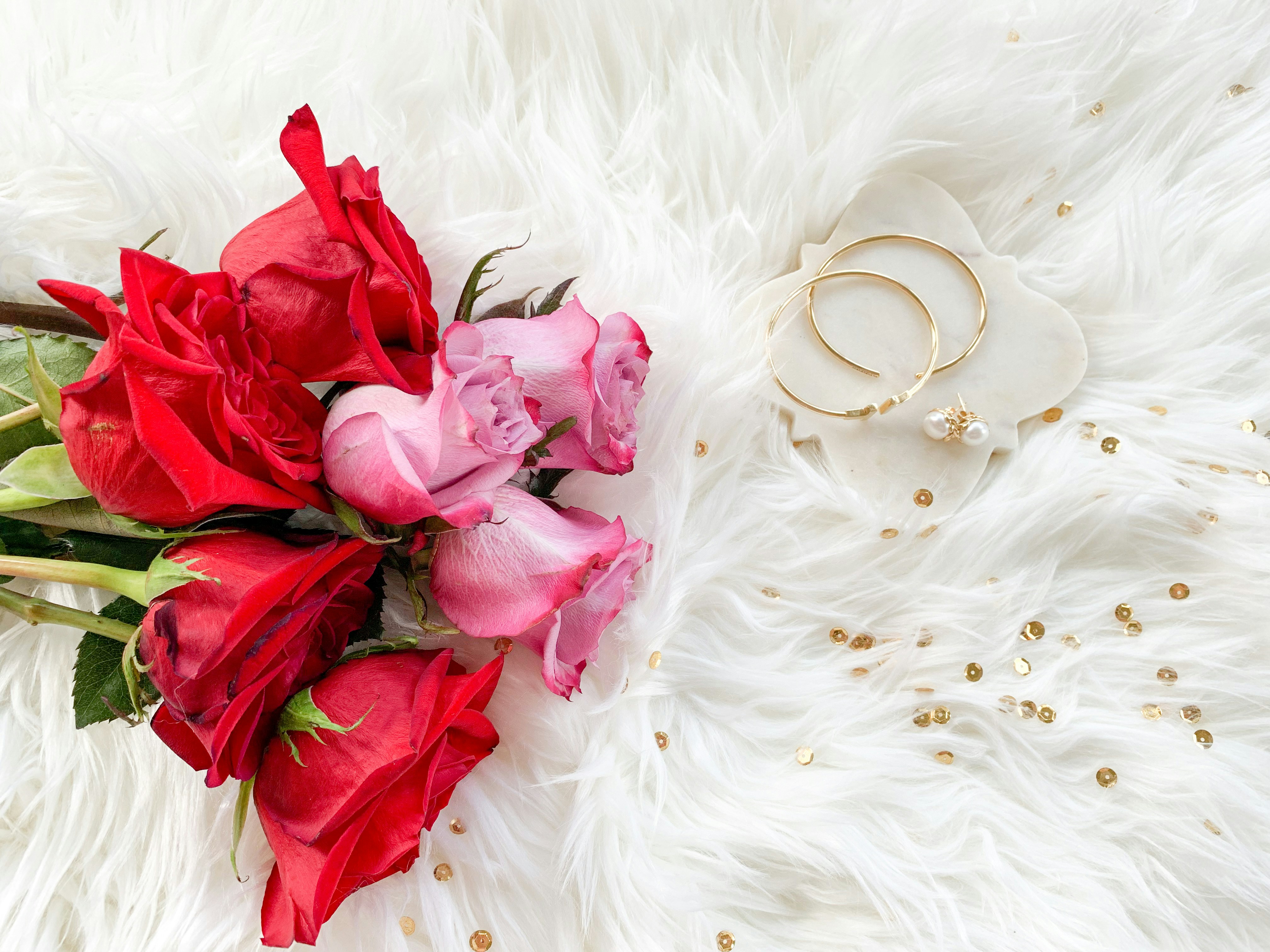 Closeup Red White Petaled Flowers Rose Pearls Wedding