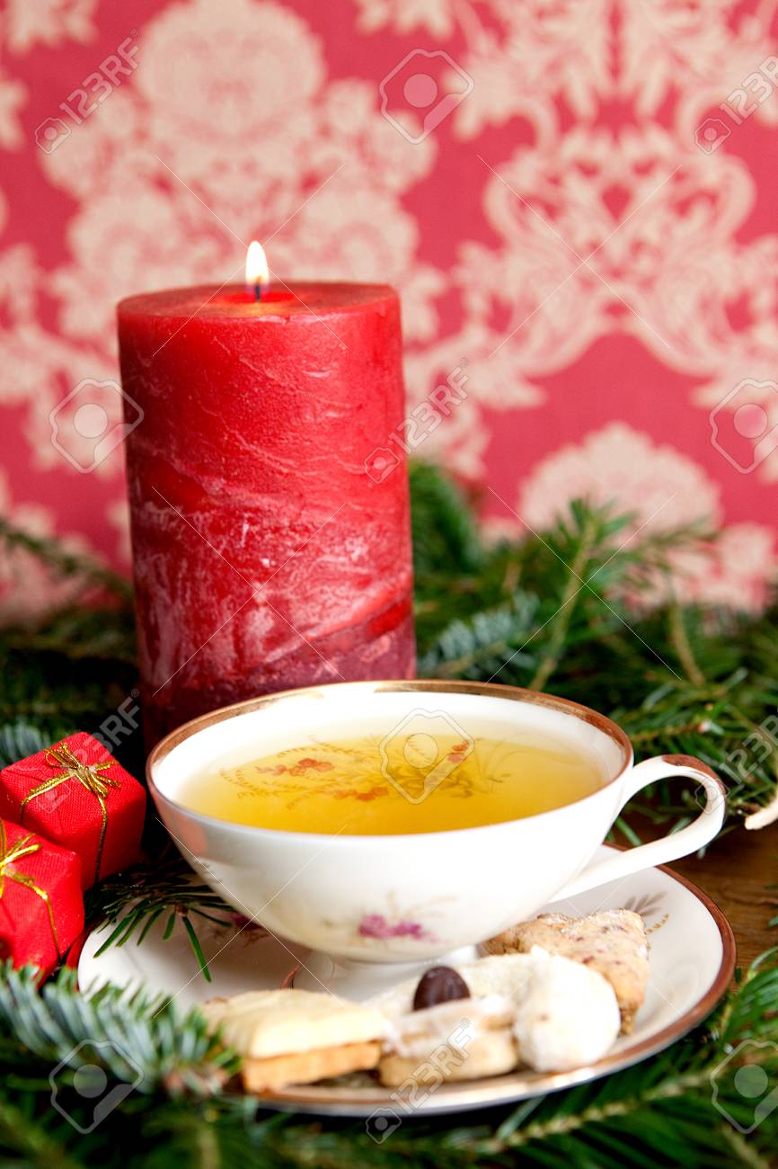 Christmas Tea With Cookies And Lighted Candle In Front Of Retro