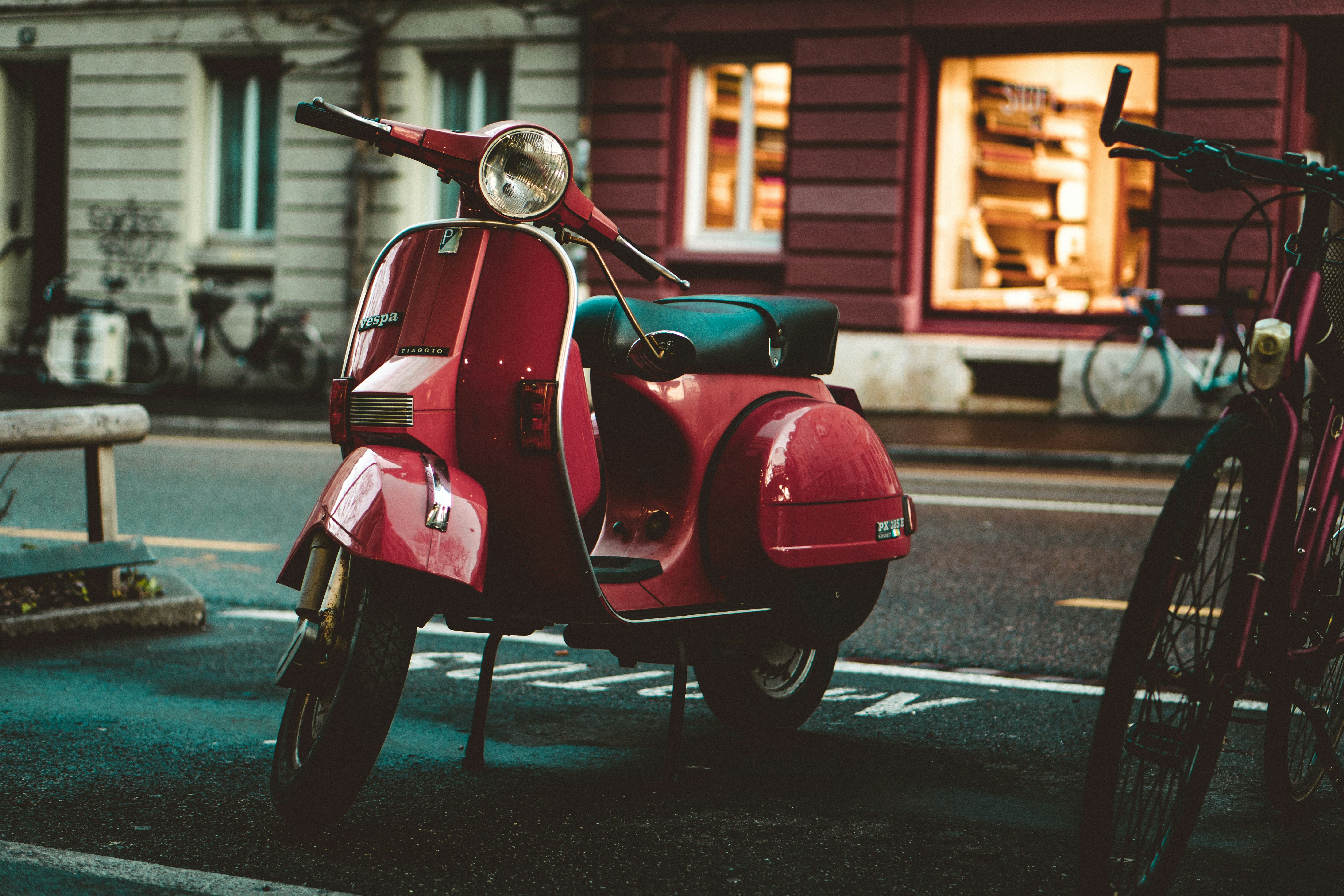 Red Motor Scooter Parked Beside The Beige Concrete Wall Free