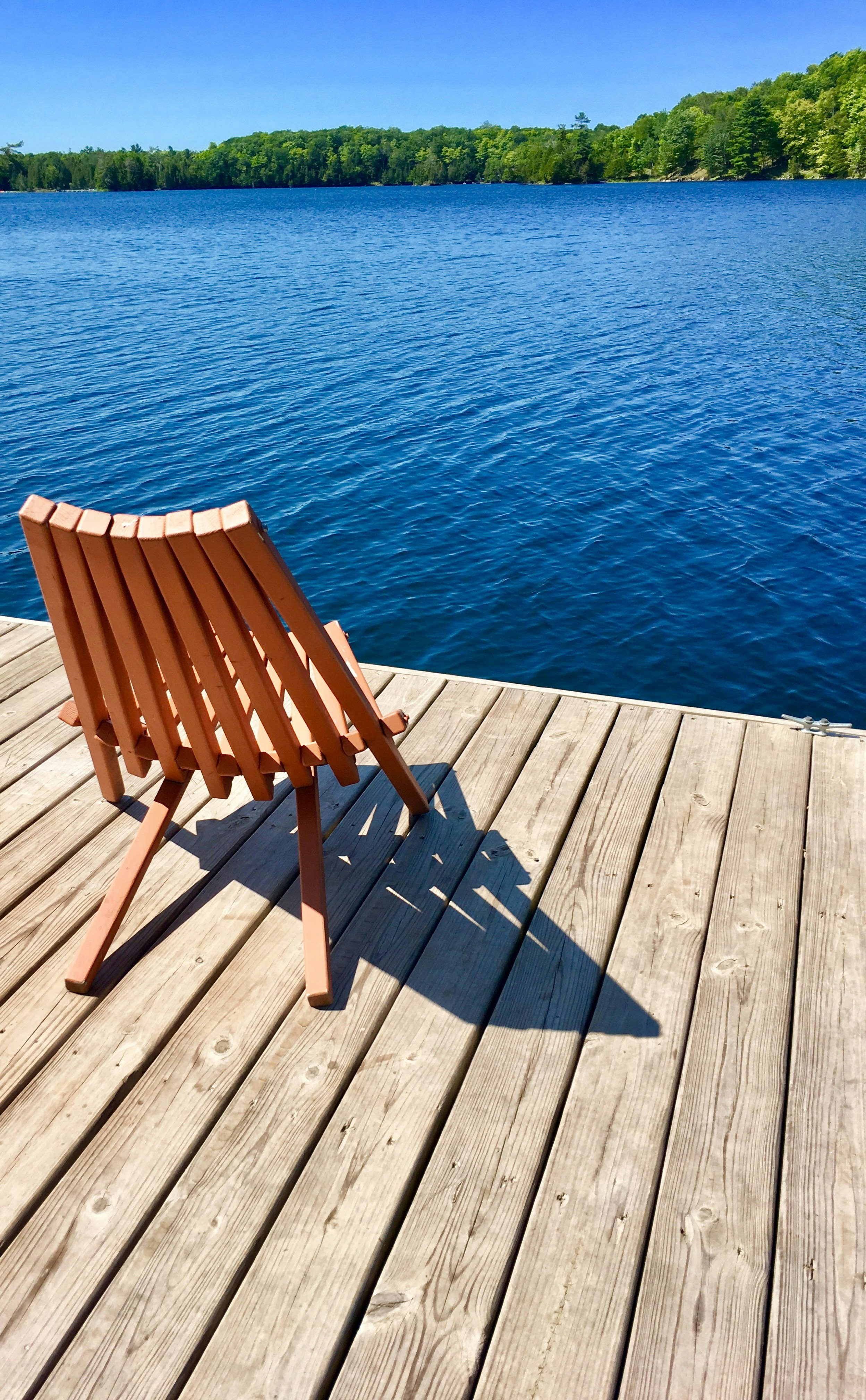 Red Wooden Lounge Chair On Brown Boardwalk Near Body Of Water