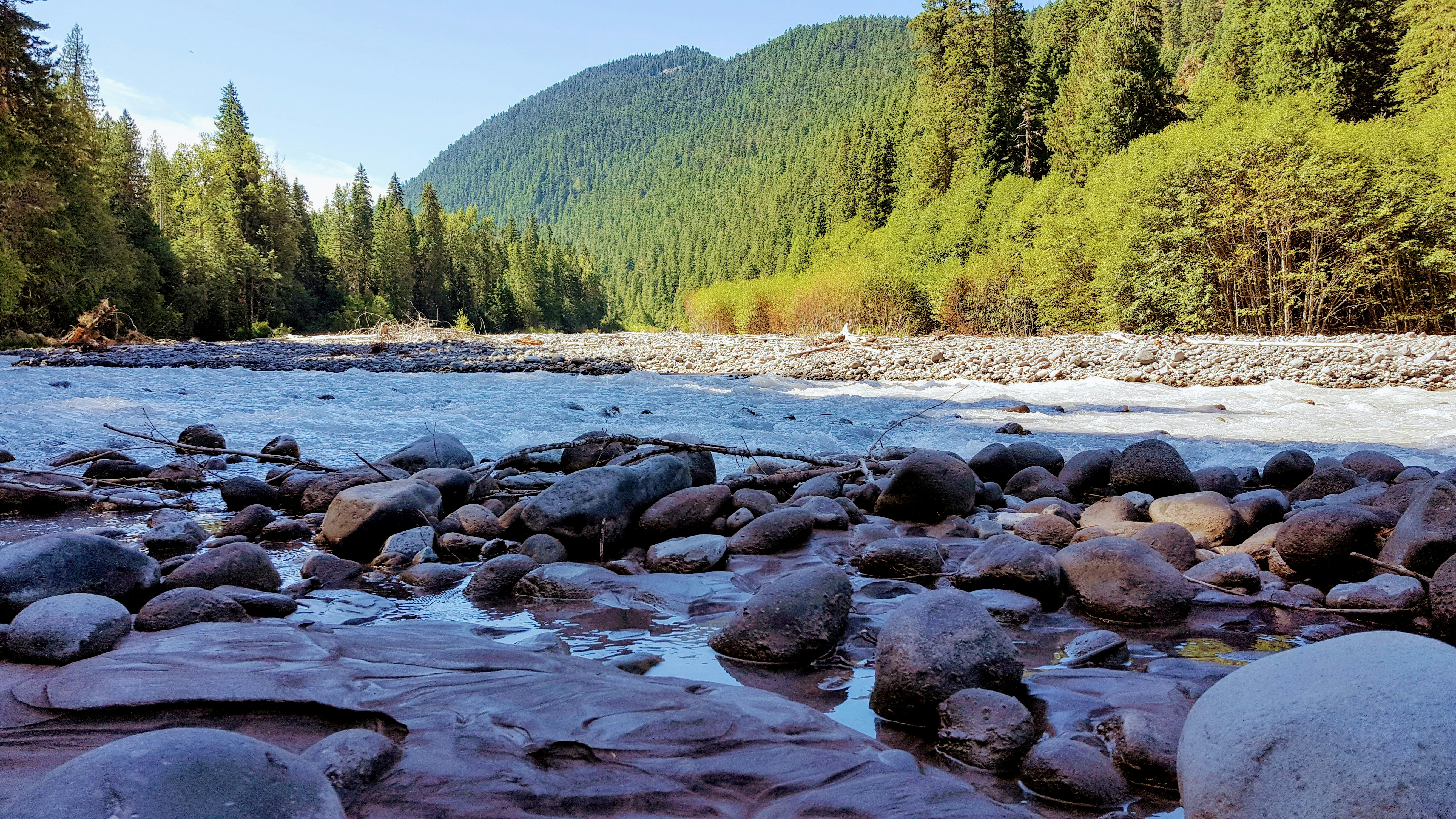 Gray Rocks On River Surrounded With Tall And Green Trees Viewing