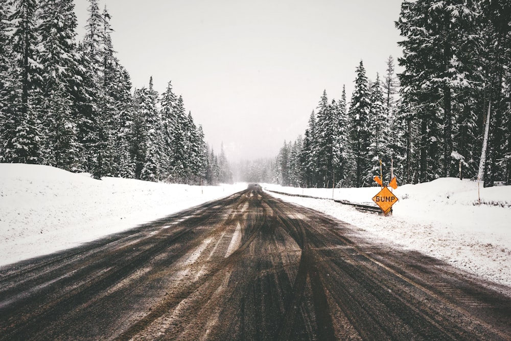 Road Surrounded By Pine Trees With White Snow During Daytime Photo