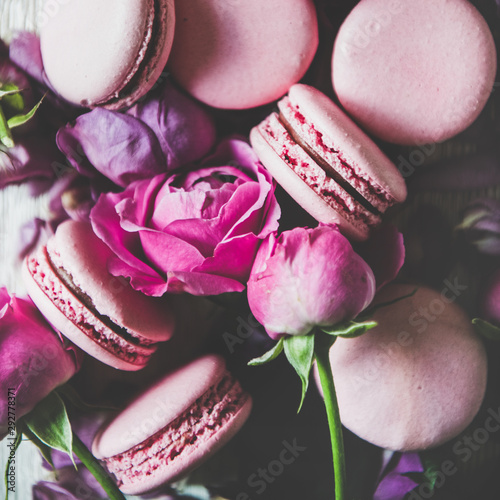 Sweet Pink Macaron Cookies And Spring Rose Flowers Buds And