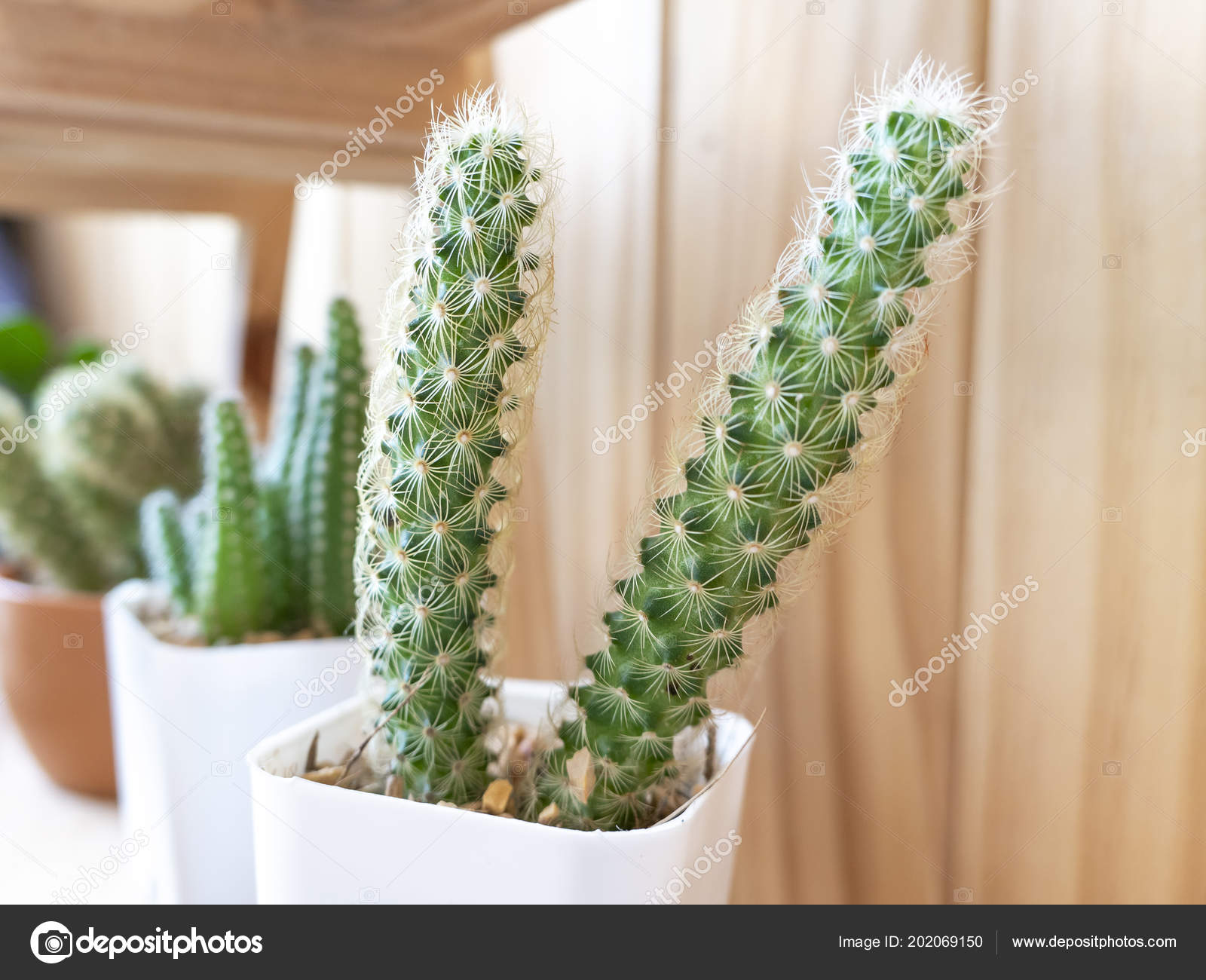 Closeup Cactus White Pot Wooden Background Selective Focus Stock