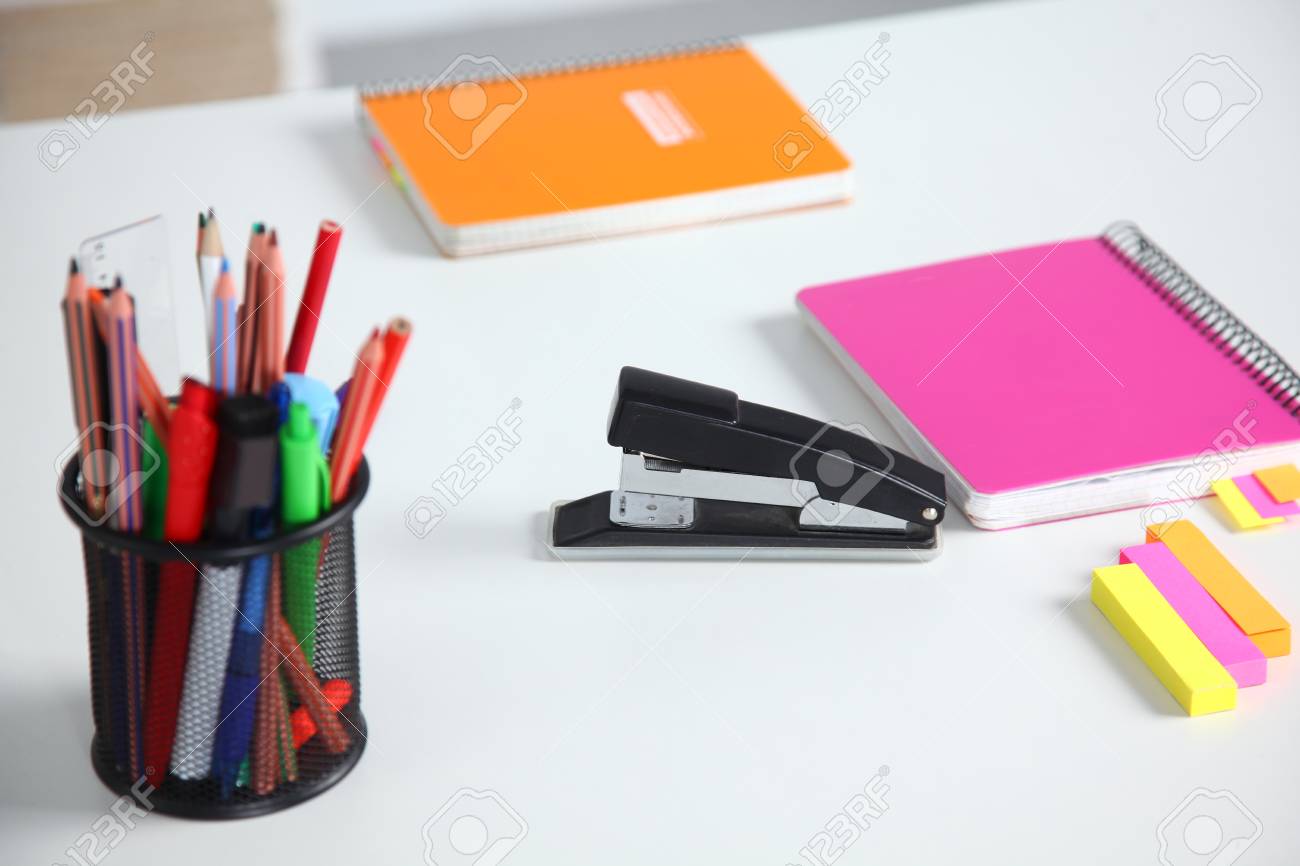 Closeup Of White Desktop With Notepads Pen Coffee Cup And Other