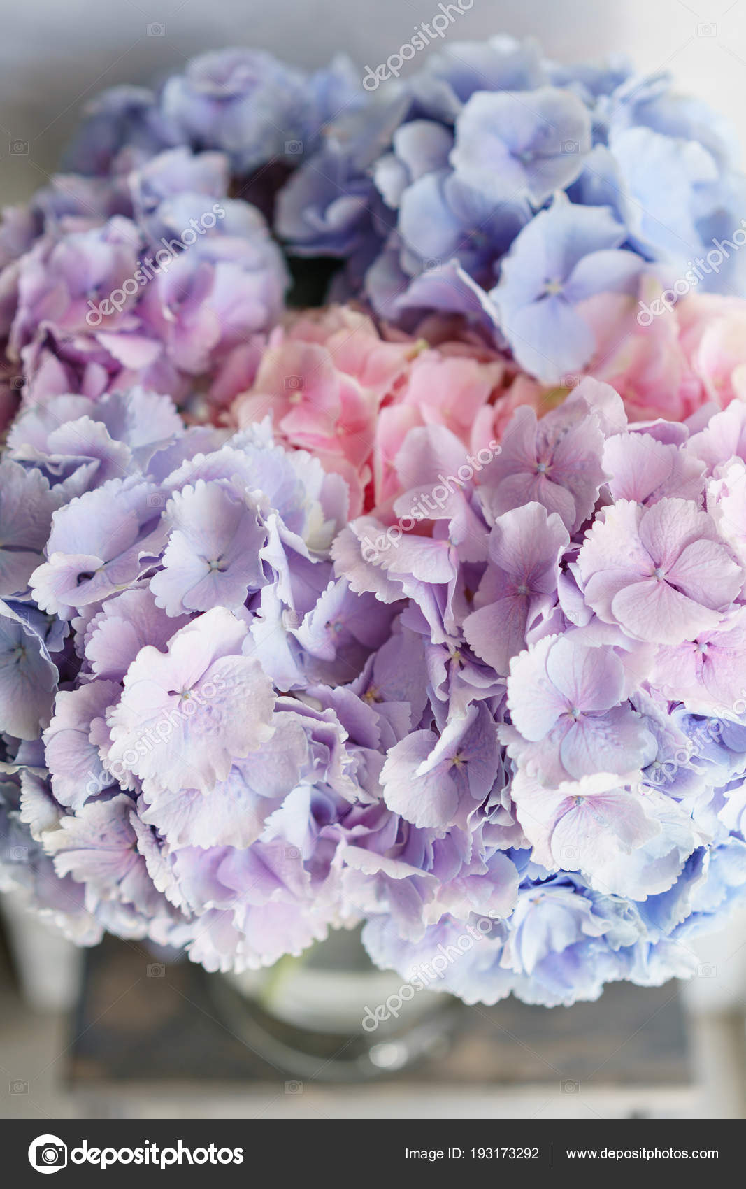 Beautiful Hydrangea Flowers In A Vase On A Table Bouquet Of Light Blue Lilac And Pink Flower Decoration Of Home Wallpaper And Background Vertical Photo Stock Photo C Malkovkosta 193173292
