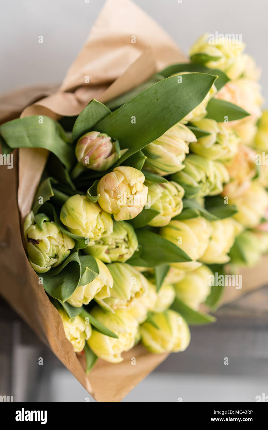 Shallow focus photo of pink flower. Drop of water drip. Two gray butterflies on yellow flowers. Rose flower petal love.